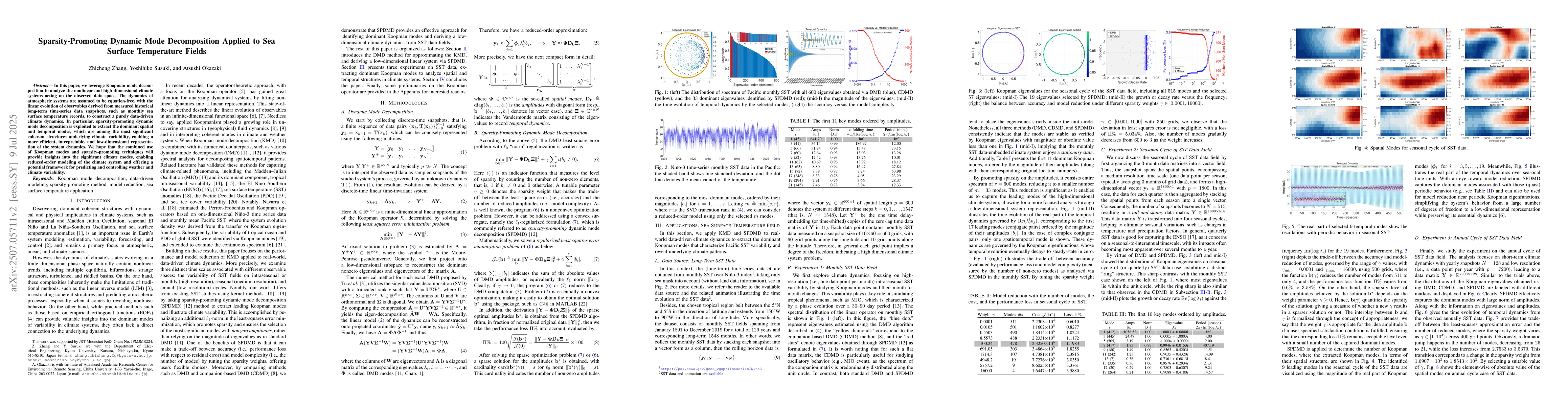 In this paper, we leverage Koopman mode decomposition to analyze the nonlinear and high-dimensional climate systems acting on the observed data space. The dynamics of atmospheric systems are assumed to be equation-free, with the linear evolution of observables derived from measured historical long-term time-series data snapshots, such as monthly sea surface temperature records, to construct a purely data-driven climate dynamics. In particular, sparsity-promoting dynamic mode decomposition is exploited to extract the dominant spatial and temporal modes, which are among the most significant coherent structures underlying climate variability, enabling a more efficient, interpretable, and low-dimensional representation of the system dynamics. We hope that the combined use of Koopman modes and sparsity-promoting techniques will provide insights into the significant climate modes, enabling reduced-order modeling of the climate system and offering a potential framework for predicting and controlling weather and climate variability.