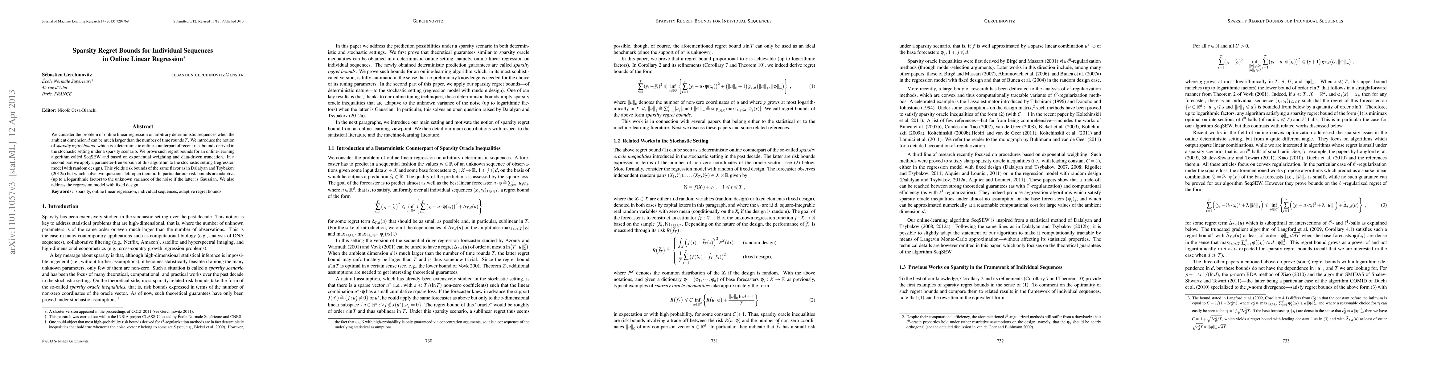 We consider the problem of online linear regression on arbitrary deterministic sequences when the ambient dimension d can be much larger than the number of time rounds T. We introduce the notion of sparsity regret bound, which is a deterministic online counterpart of recent risk bounds derived in the stochastic setting under a sparsity scenario. We prove such regret bounds for an online-learning algorithm called SeqSEW and based on exponential weighting and data-driven truncation. In a second part we apply a parameter-free version of this algorithm to the stochastic setting (regression model with random design). This yields risk bounds of the same flavor as in Dalalyan and Tsybakov (2011) but which solve two questions left open therein. In particular our risk bounds are adaptive (up to a logarithmic factor) to the unknown variance of the noise if the latter is Gaussian. We also address the regression model with fixed design.