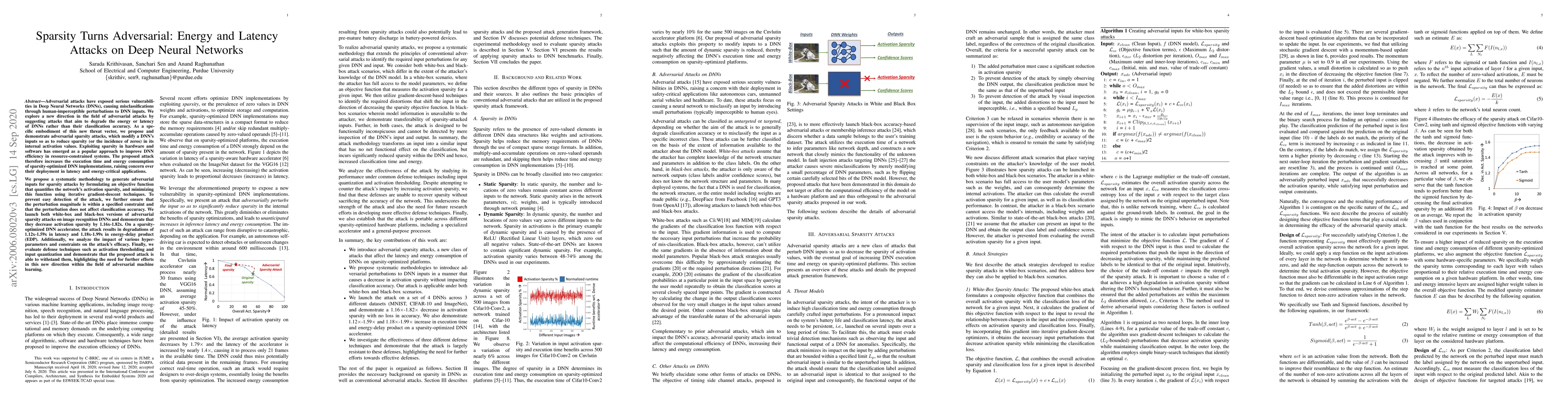 This paper introduces sparsity attacks that degrade the computational efficiency of Deep Neural Networks (DNNs) by reducing their internal activation sparsity, thereby increasing energy consumption and latency. The authors propose a systematic methodology to generate adversarial inputs and demonstrate significant impacts on both specialized DNN accelerators and general-purpose processors, highlighting the need for new defense strategies against these efficiency-focused adversarial attacks.