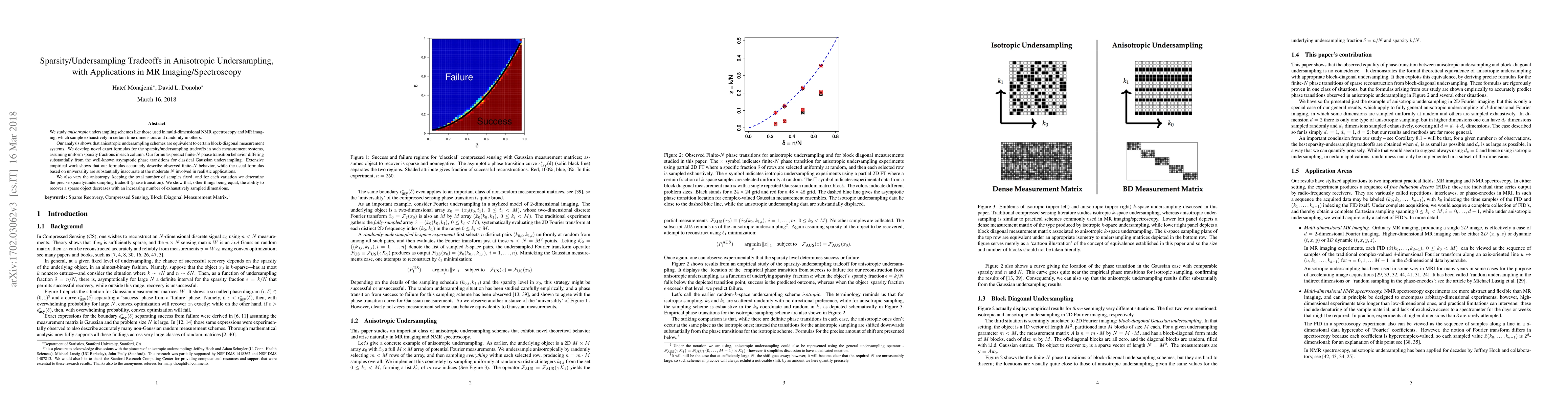 We study anisotropic undersampling schemes like those used in multi-dimensional NMR spectroscopy and MR imaging, which sample exhaustively in certain time dimensions and randomly in others. Our analysis shows that anisotropic undersampling schemes are equivalent to certain block-diagonal measurement systems. We develop novel exact formulas for the sparsity/undersampling tradeoffs in such measurement systems. Our formulas predict finite-N phase transition behavior differing substantially from the well known asymptotic phase transitions for classical Gaussian undersampling. Extensive empirical work shows that our formulas accurately describe observed finite-N behavior, while the usual formulas based on universality are substantially inaccurate. We also vary the anisotropy, keeping the total number of samples fixed, and for each variation we determine the precise sparsity/undersampling tradeoff (phase transition). We show that, other things being equal, the ability to recover a sparse object decreases with an increasing number of exhaustively-sampled dimensions.