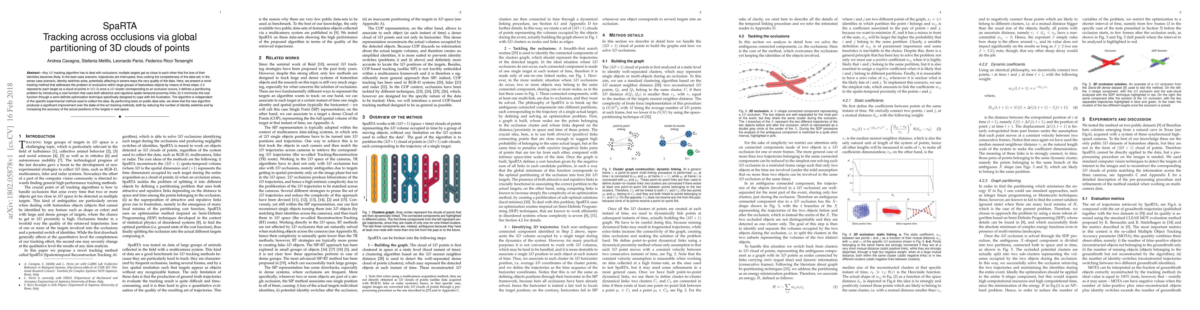 Any 3D tracking algorithm has to deal with occlusions: multiple targets get so close to each other that the loss of their identities becomes likely. In the best case scenario, trajectories are interrupted, thus curbing the completeness of the data-set; in the worse case scenario, identity switches arise, potentially affecting in severe ways the very quality of the data. Here, we present a novel tracking method that addresses the problem of occlusions within large groups of featureless objects by means of three steps: i) it represents each target as a cloud of points in 3D; ii) once a 3D cluster corresponding to an occlusion occurs, it defines a partitioning problem by introducing a cost function that uses both attractive and repulsive spatio-temporal proximity links; iii) it minimizes the cost function through a semi-definite optimization technique specifically designed to cope with link frustration. The algorithm is independent of the specific experimental method used to collect the data. By performing tests on public data-sets, we show that the new algorithm produces a significant improvement over the state-of-the-art tracking methods, both by reducing the number of identity switches and by increasing the accuracy of the actual positions of the targets in real space.