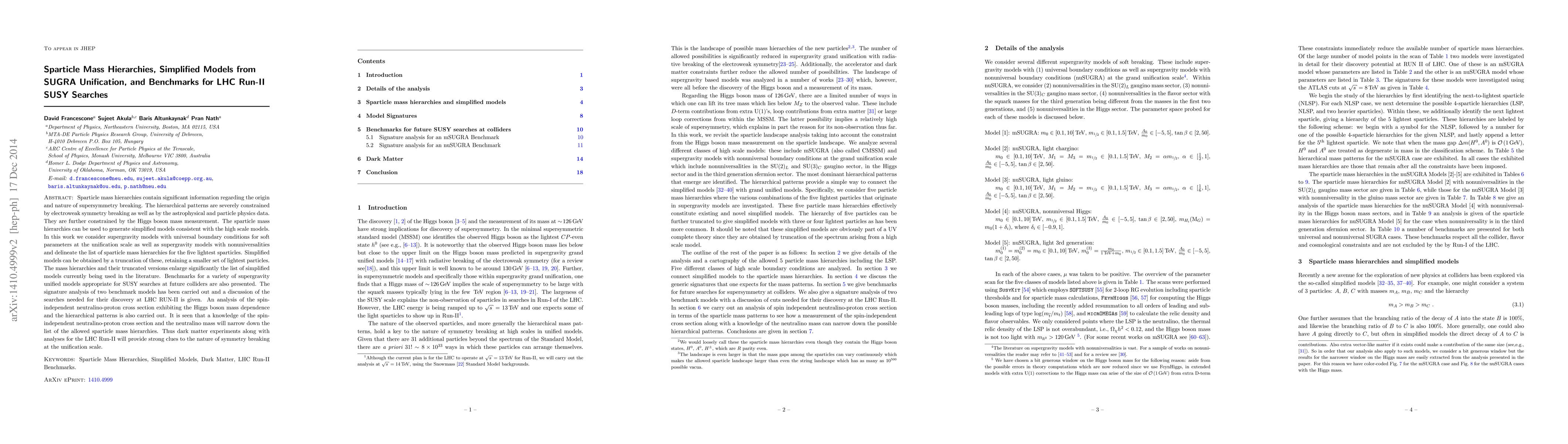 Sparticle mass hierarchies contain significant information regarding the origin and nature of supersymmetry breaking. The hierarchical patterns are severely constrained by electroweak symmetry breaking as well as by the astrophysical and particle physics data. They are further constrained by the Higgs boson mass measurement. The sparticle mass hierarchies can be used to generate simplified models consistent with the high scale models. In this work we consider supergravity models with universal boundary conditions for soft parameters at the unification scale as well as supergravity models with nonuniversalities and delineate the list of sparticle mass hierarchies for the five lightest sparticles. Simplified models can be obtained by a truncation of these, retaining a smaller set of lightest particles. The mass hierarchies and their truncated versions enlarge significantly the list of simplified models currently being used in the literature. Benchmarks for a variety of supergravity unified models appropriate for SUSY searches at future colliders are also presented. The signature analysis of two benchmark models has been carried out and a discussion of the searches needed for their discovery at LHC RUN-II is given. An analysis of the spin independent neutralino-proton cross section exhibiting the Higgs boson mass dependence and the hierarchical patterns is also carried out. It is seen that a knowledge of the spin independent neutralino-proton cross section and the neutralino mass will narrow down the list of the allowed sparticle mass hierarchies. Thus dark matter experiments along with analyses for the LHC Run-II will provide strong clues to the nature of symmetry breaking at the unification scale.