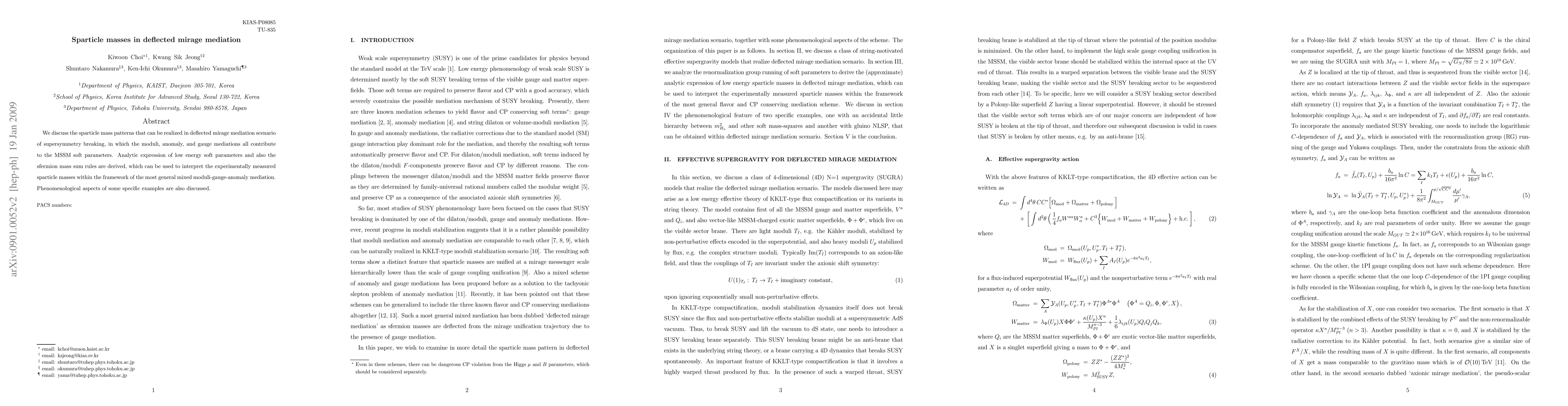 This paper explores sparticle mass patterns in deflected mirage mediation, where moduli, anomaly, and gauge mediations collectively influence MSSM soft parameters. It derives analytic expressions for low-energy soft parameters and sfermion mass sum rules, enabling the interpretation of experimentally measured sparticle masses within a mixed mediation framework.