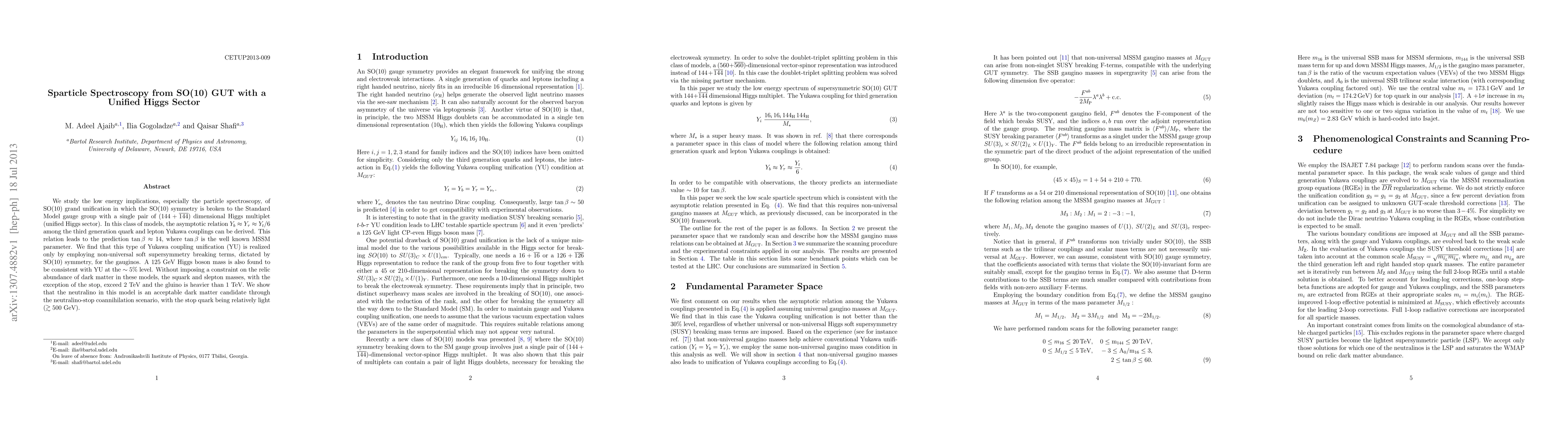 This paper explores the particle spectrum implications of SO(10) grand unification with a unified Higgs sector, deriving Yukawa coupling unification and predicting a tanβ of approximately 14. It finds that non-universal soft supersymmetry breaking terms are necessary for consistency, and identifies the neutralino as a viable dark matter candidate through neutralino-stop coannihilation.