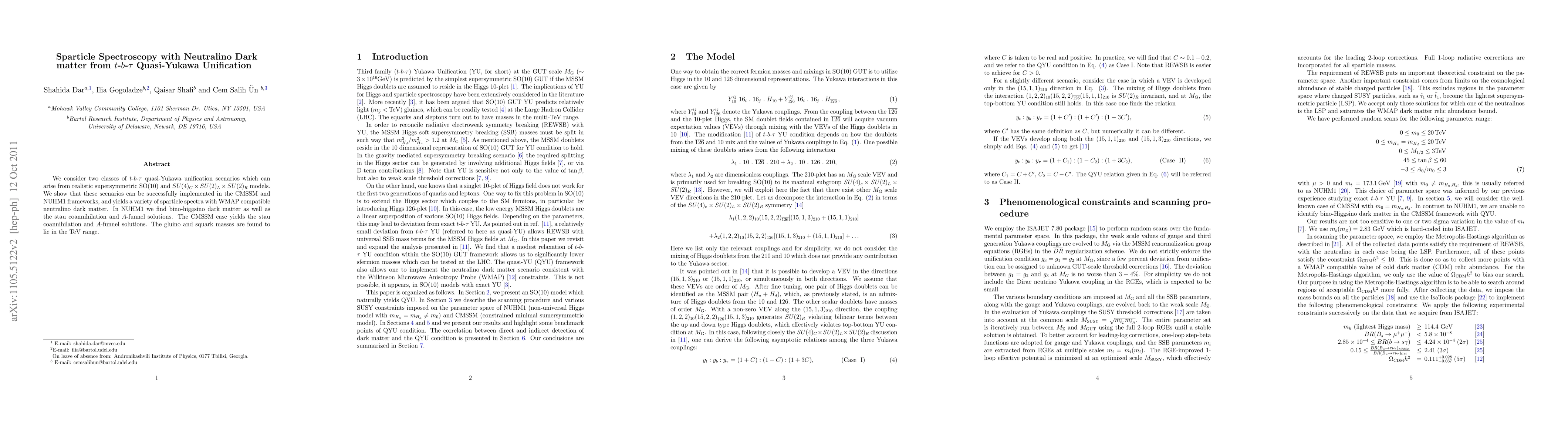 This paper explores t-b-tau quasi-Yukawa unification scenarios in supersymmetric SO(10) and SU(4)_C models, demonstrating successful implementation in CMSSM and NUHM1 frameworks that yield diverse sparticle spectra compatible with WMAP neutralino dark matter. Both frameworks support stau coannihilation and A-funnel solutions, with gluino and squark masses in the TeV range.