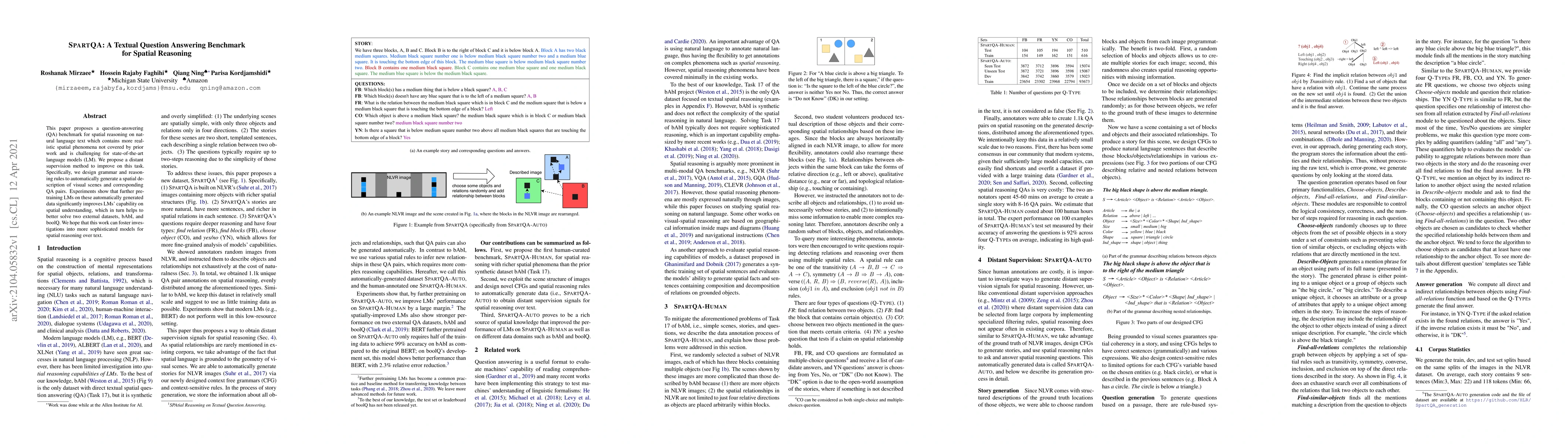 This paper introduces SpartQA, a new benchmark for spatial reasoning in textual question answering, featuring realistic spatial phenomena. The authors propose a distant supervision method to generate spatial descriptions and QA pairs, which enhances language models' spatial understanding, as demonstrated by improved performance on bAbI and boolQ.