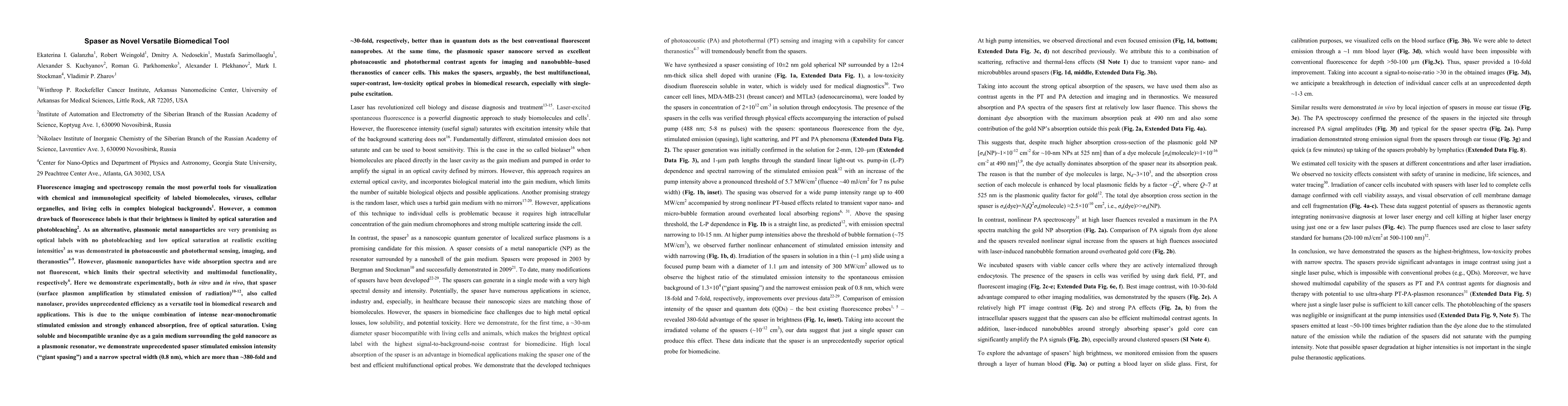 Fluorescence imaging and spectroscopy remain the most powerful tools for visualization with chemical and immunological specificity of labeled biomolecules, viruses, cellular organelles, and living cells in complex biological backgrounds. However, a common drawback of fluorescence labels is that their brightness is limited by optical saturation and photobleaching. As an alternative, plasmonic metal nanoparticles are very promising as optical labels with no photobleaching and low optical saturation at realistic exciting intensities as was demonstrated in photoacoustic and photothermal sensing, imaging, and theranostics. However, plasmonic nanoparticles have wide absorption spectra and are not fluorescent, which limits their spectral selectivity and multimodal functionality, respectively. Here we demonstrate experimentally, both in vitro and in vivo, that spaser (surface plasmon amplification by stimulated emission of radiation) provides unprecedented efficiency as a versatile tool in biomedical research and applications. This is due to the unique combination of intense near-monochromatic stimulated emission and strongly enhanced absorption, free of optical saturation. Using soluble and biocompatible uranine dye as a gain medium surrounding the gold nanocore as a plasmonic resonator, we demonstrate unprecedented spaser stimulated emission intensity ("giant spasing") and a narrow spectral width (0.8 nm), which are more than ~380-fold and ~30-fold, respectively, better than in quantum dots as the best conventional fluorescent nanoprobes. At the same time, the plasmonic spaser nanocore served as excellent photoacoustic and photothermal contrast agents for imaging and nanobubble-based theranostics of cancer cells. This makes the spasers, arguably, the best multifunctional, super-contrast, low-toxicity optical probes in biomedical research, especially with single-pulse excitation.