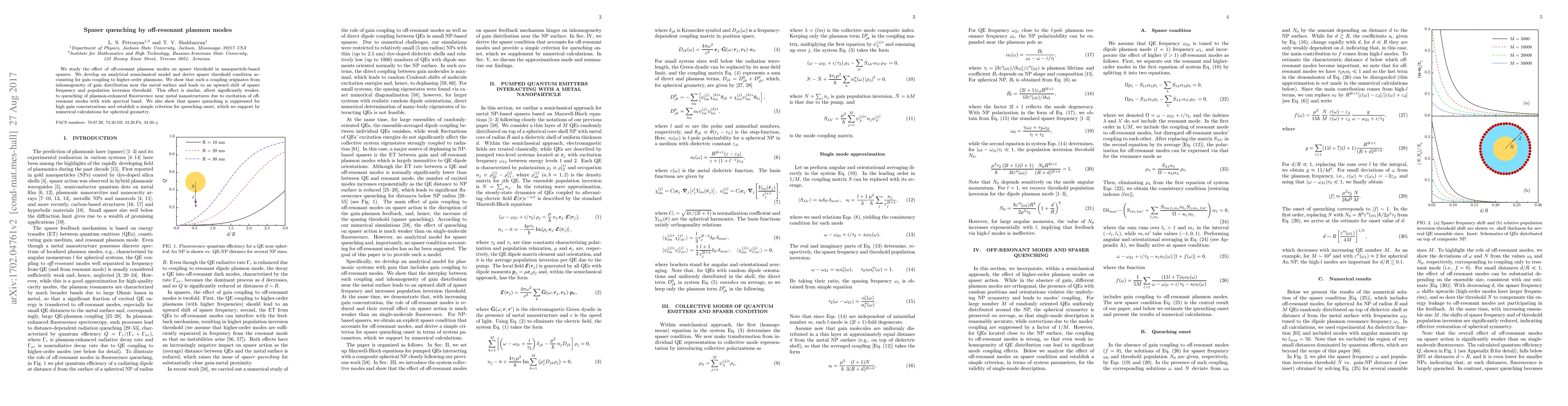 We study the effect of off-resonant plasmon modes on spaser threshold in nanoparticle-based spasers. We develop an analytical semiclassical model and derive spaser threshold condition accounting for gain coupling to higher-order plasmons. We show that such a coupling originates from inhomogeneity of gain distribution near the metal surface and leads to an upward shift of spaser frequency and population inversion threshold. This effect is similar, albeit significantly weaker, to quenching of plasmon-enhanced fluorescence near metal nanostructures due to excitation of off-resonant modes with wide spectral band. We also show that spaser quenching is suppressed for high gain concentrations and establish a simple criterion for quenching onset, which we support by numerical calculations for spherical geometry.