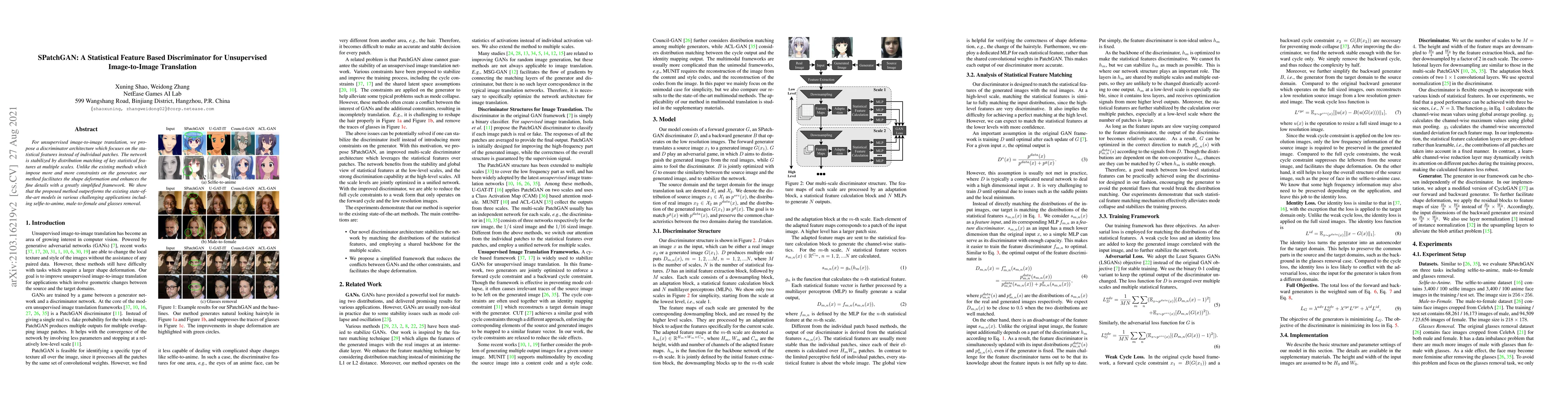 The paper introduces SPatchGAN, a novel discriminator for unsupervised image-to-image translation that uses statistical features rather than individual patches. This approach simplifies the framework, enhances fine details, and facilitates shape deformation, outperforming existing models in tasks like selfie-to-anime, male-to-female, and glasses removal.