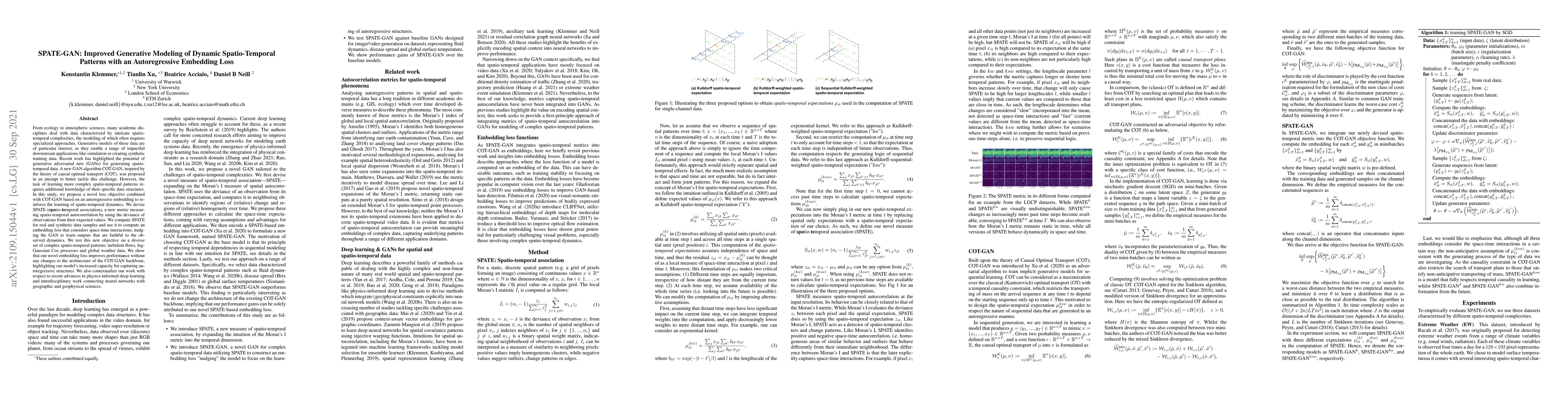 SPATE-GAN introduces an autoregressive embedding loss to enhance the generative modeling of complex spatio-temporal patterns, improving the learning of dynamic data structures without altering the COT-GAN architecture. The SPATE metric measures spatio-temporal autocorrelation, guiding the GAN to produce outputs that accurately reflect observed dynamics.