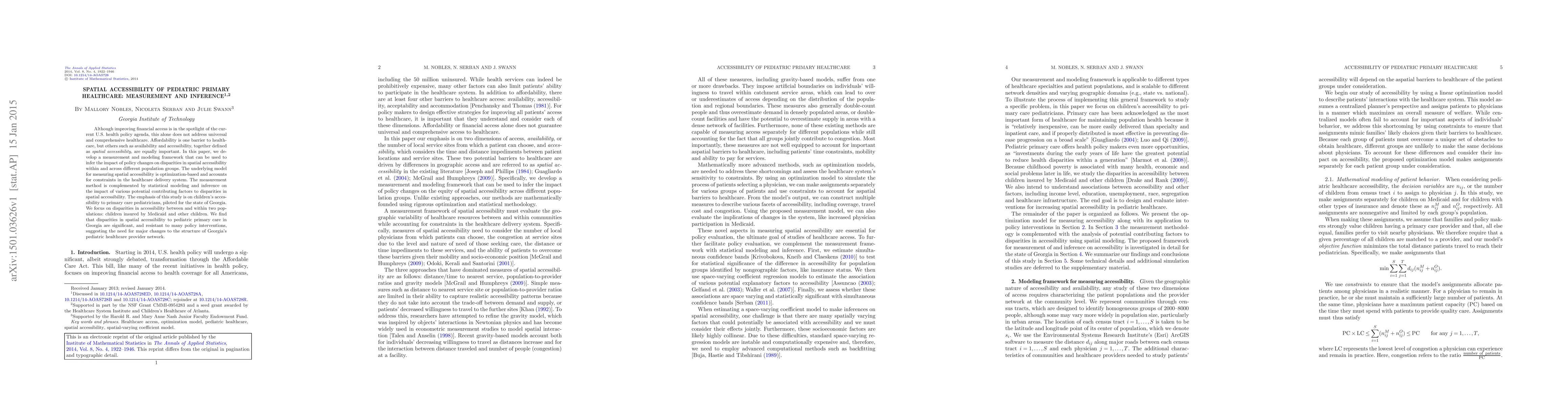 This paper develops a framework to measure and model spatial accessibility to pediatric primary healthcare, focusing on disparities in Georgia. It finds significant disparities in access between Medicaid-insured children and others, indicating a need for structural changes in the pediatric healthcare provider network.