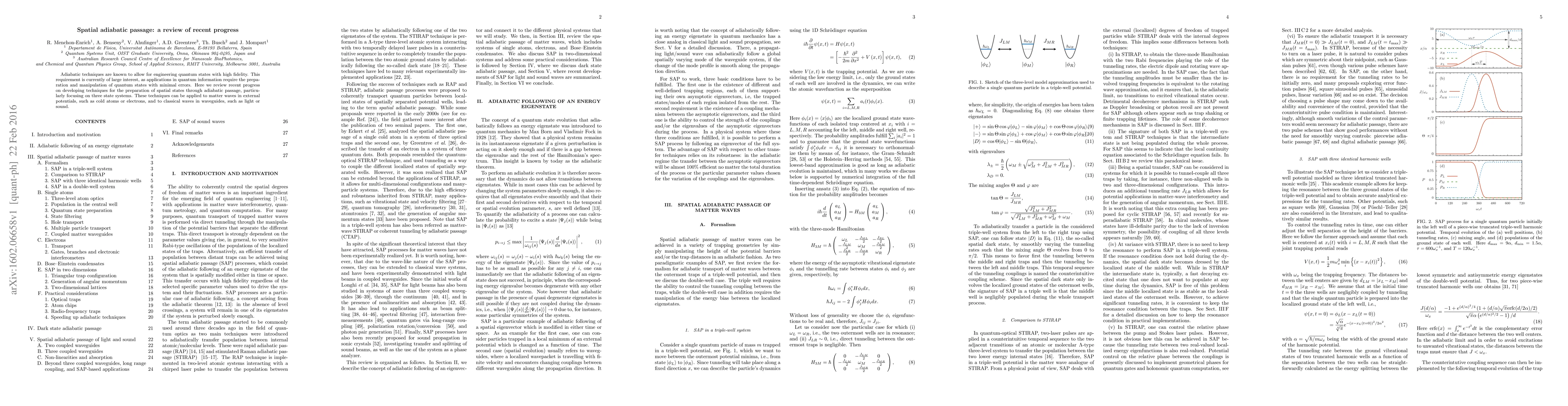 This paper reviews recent advancements in spatial adiabatic passage techniques for preparing quantum states with high fidelity, emphasizing three-state systems and their applications to matter waves and classical waves in various potentials. The focus is on minimizing errors in quantum information processing.