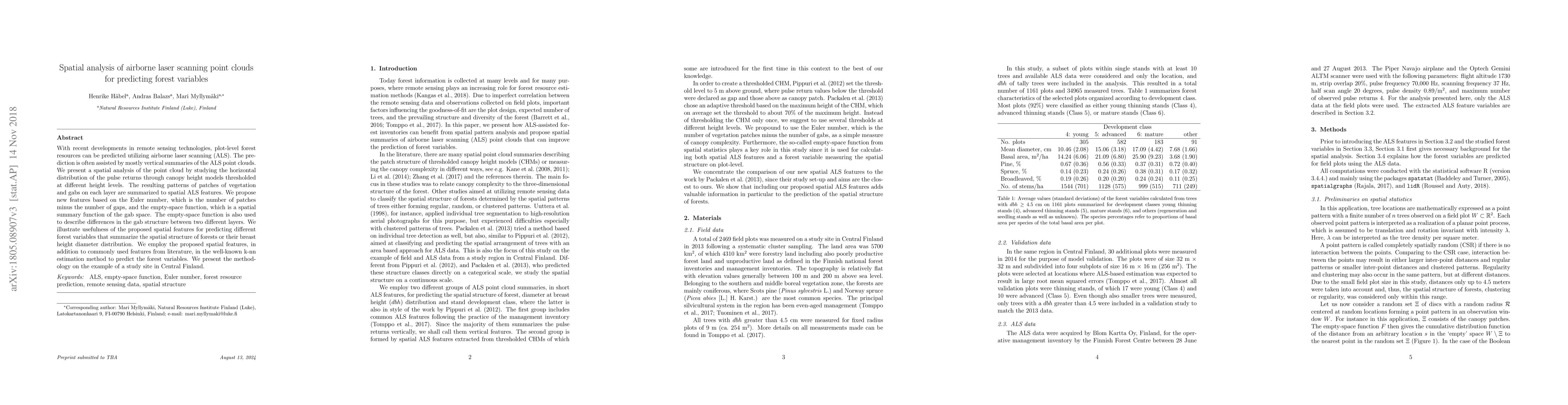 This paper proposes spatial analysis techniques for airborne laser scanning (ALS) point clouds to predict forest variables by examining horizontal distributions of pulse returns through canopy height models. The study introduces new spatial features based on the Euler number and the empty-space function, which are used alongside traditional features in k-nearest neighbor (k-nn) estimation to predict forest variables in Central Finland.