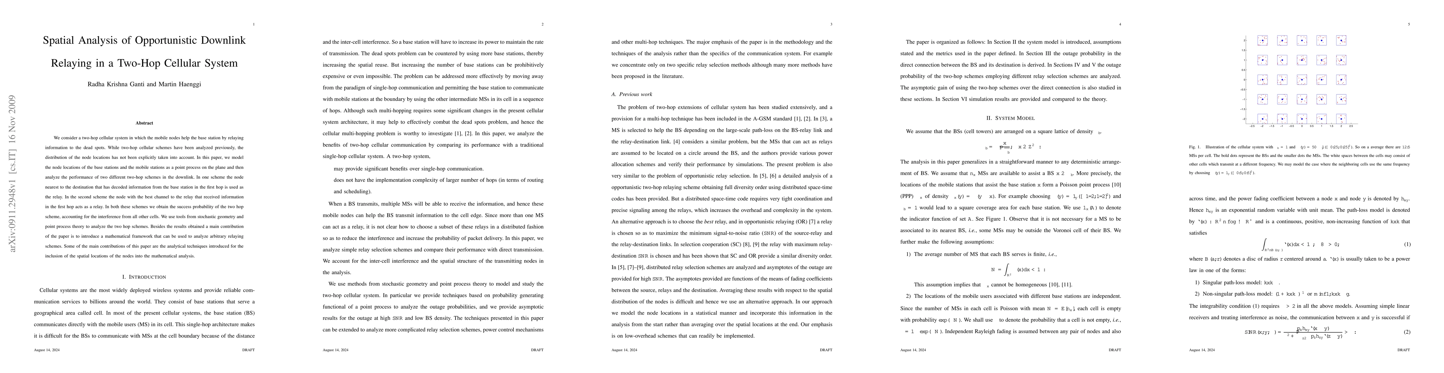 Researchers analyzed two-hop cellular systems with mobile nodes relaying information to base stations, considering node locations as a point process on the plane. They introduced new analytical techniques to account for spatial locations in the analysis.