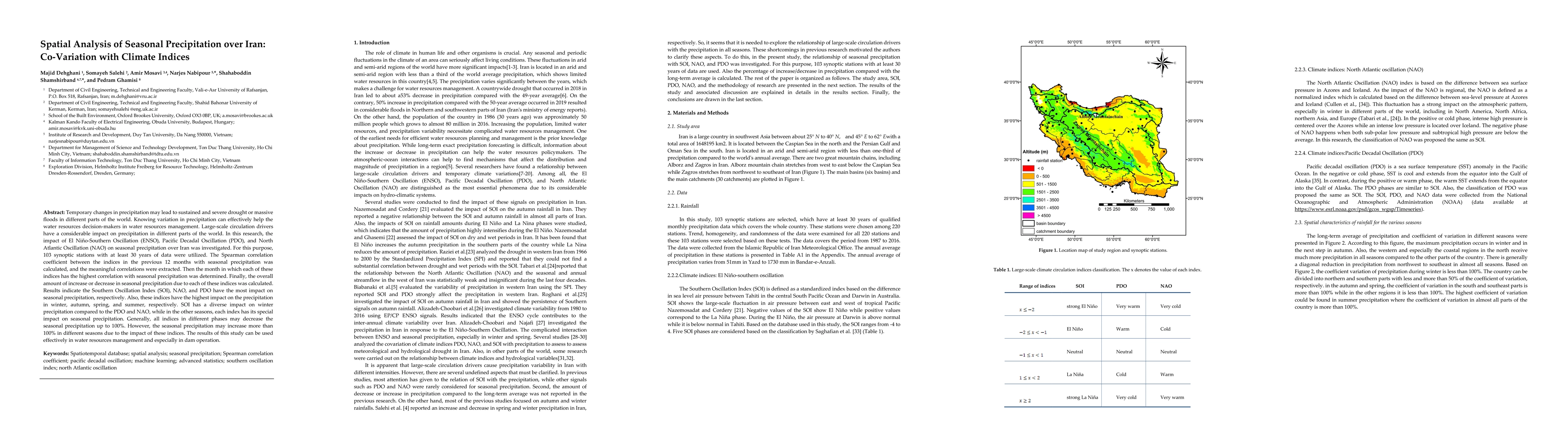 This study investigates the influence of climate indices (ENSO, PDO, NAO) on seasonal precipitation in Iran using data from 103 synoptic stations. Results show that SOI, NAO, and PDO significantly affect winter, autumn, spring, and summer precipitation, respectively, with potential decreases or increases of up to 100%. These findings are valuable for water resources management and dam operation.