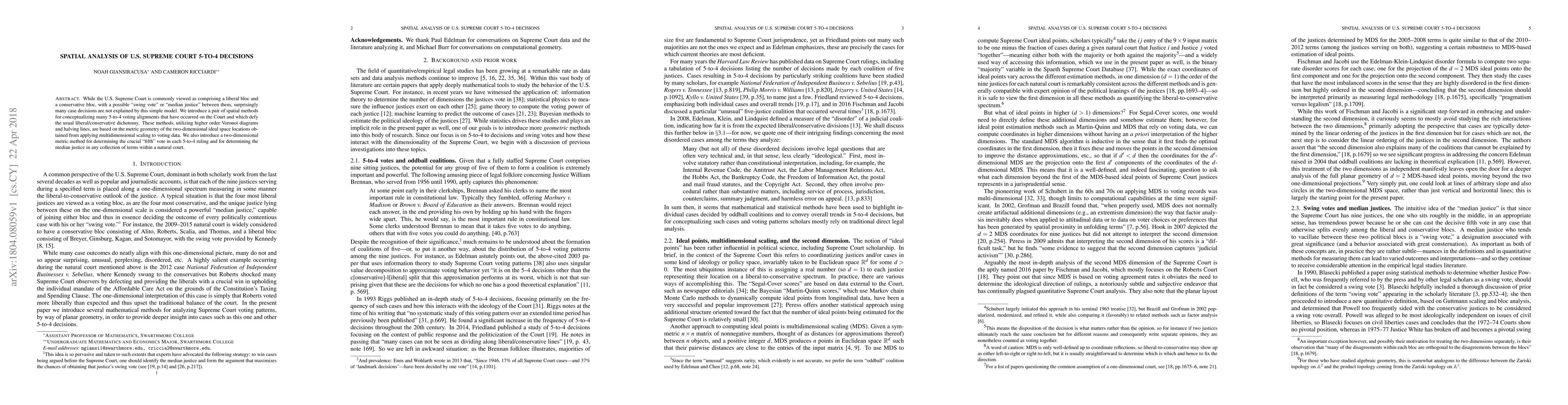 This paper introduces spatial methods using higher order Voronoi diagrams and k-sets to analyze U.S. Supreme Court 5-to-4 decisions, revealing voting patterns that challenge the traditional liberal/conservative bloc model. It also proposes a metric method to identify the crucial fifth vote in each ruling and the median justice.