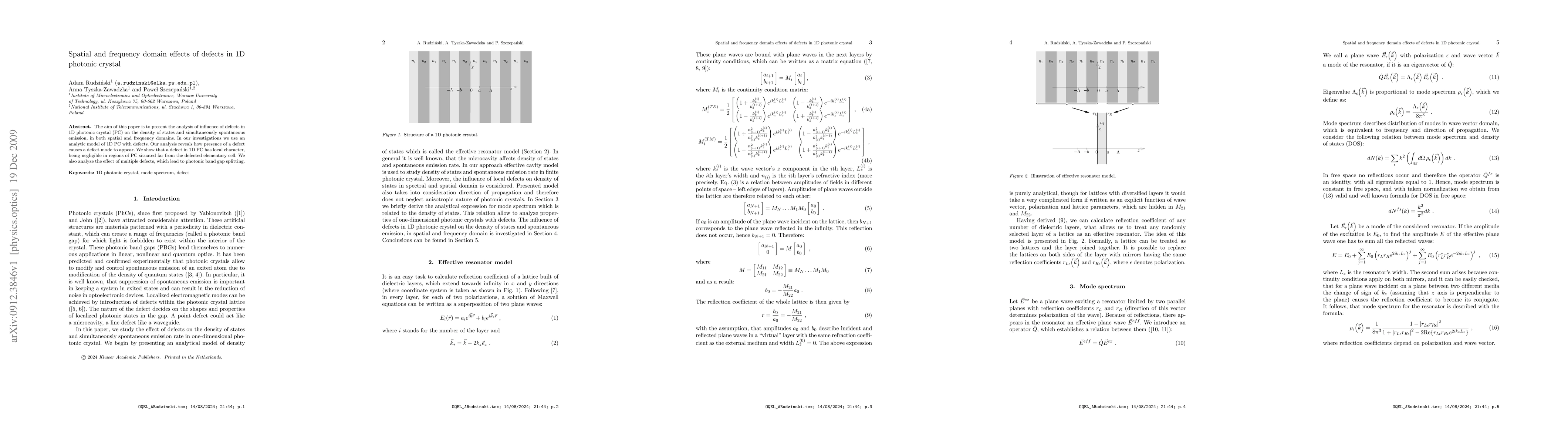 An analytic model of 1D PC with defects was used to analyze the influence of defects on the density of states and spontaneous emission in both spatial and frequency domains.
