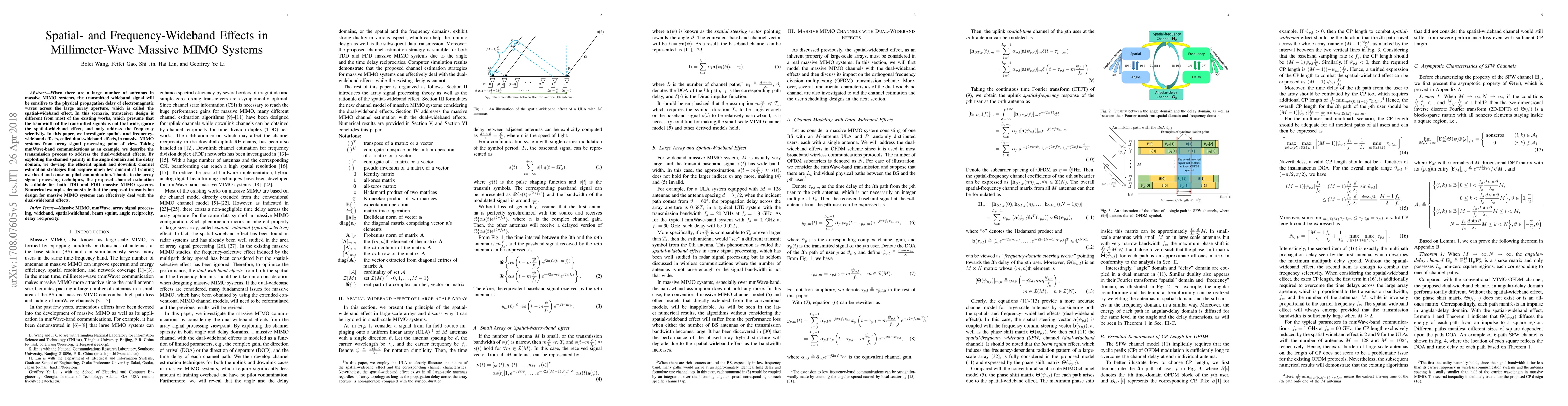 When there are a large number of antennas in massive MIMO systems, the transmitted wideband signal will be sensitive to the physical propagation delay of electromagnetic waves across the large array aperture, which is called the spatial-wideband effect. In this scenario, transceiver design is different from most of the existing works, which presume that the bandwidth of the transmitted signals is not that wide, ignore the spatial-wideband effect, and only address the frequency selectivity. In this paper, we investigate spatial- and frequency-wideband effects, called dual-wideband effects, in massive MIMO systems from array signal processing point of view. Taking mmWave-band communications as an example, we describe the transmission process to address the dual-wideband effects. By exploiting the channel sparsity in the angle domain and the delay domain, we develop the efficient uplink and downlink channel estimation strategies that require much less amount of training overhead and cause no pilot contamination. Thanks to the array signal processing techniques, the proposed channel estimation is suitable for both TDD and FDD massive MIMO systems. Numerical examples demonstrate that the proposed transmission design for massive MIMO systems can effectively deal with the dual-wideband effects.