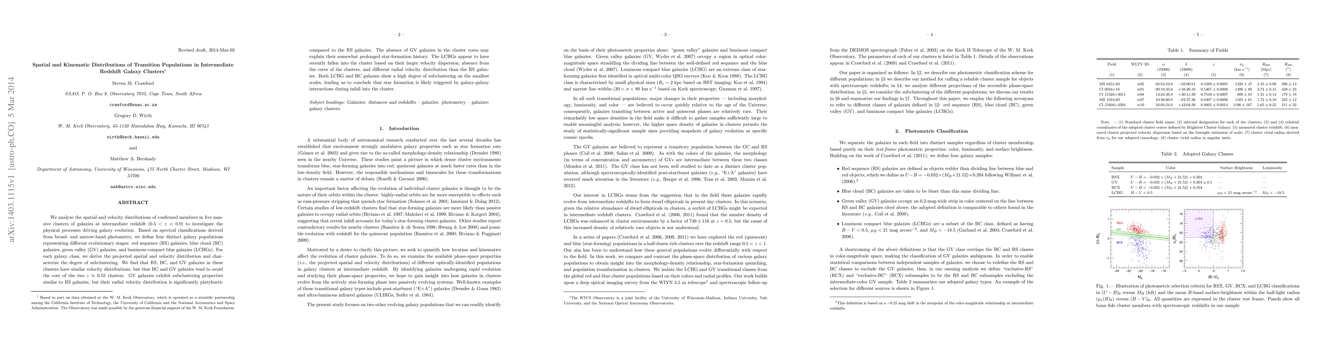 The study analyzes the spatial and kinematic distributions of confirmed members in five massive clusters of galaxies at intermediate redshift (0.5 < z < 0.9), defining four distinct galaxy populations (red sequence, blue cloud, green valley, and luminous compact blue galaxies) based on spectral classifications derived from broad- and narrow-band photometry.