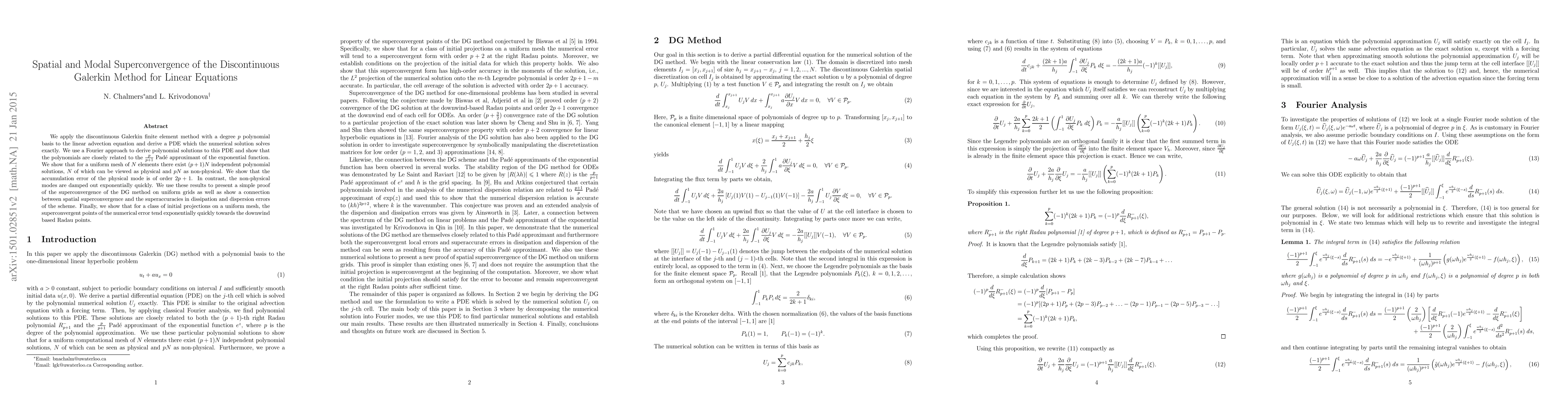 We apply the discontinuous Galerkin finite element method with a degree $p$ polynomial basis to the linear advection equation and derive a PDE which the numerical solution solves exactly. We use a Fourier approach to derive polynomial solutions to this PDE and show that the polynomials are closely related to the $\frac{p}{p+1}$ Pad\'e approximant of the exponential function. We show that for a uniform mesh of $N$ elements there exist $(p+1)N$ independent polynomial solutions, $N$ of which can be viewed as physical and $pN$ as non-physical. We show that the accumulation error of the physical mode is of order $2p+1$. In contrast, the non-physical modes are damped out exponentially quickly. We use these results to present a simple proof of the superconvergence of the DG method on uniform grids as well as show a connection between spatial superconvergence and the superaccuracies in dissipation and dispersion errors of the scheme. Finally, we show that for a class of initial projections on a uniform mesh, the superconvergent points of the numerical error tend exponentially quickly towards the downwind based Radau points.
