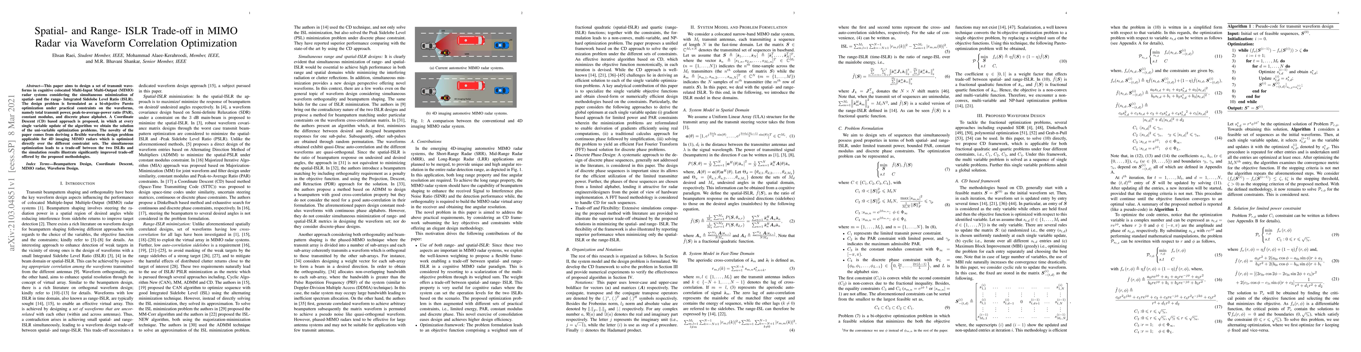 This paper aims to design a set of transmitting waveforms in cognitive colocated Multi-Input Multi-Output (MIMO) radar systems considering the simultaneous minimization of spatial- and the range- Integrated Sidelobe Level Ratio (ISLR). The design problem is formulated as a bi-objective Pareto optimization under practical constraints on the waveforms, namely total transmit power, peak-to-average-power ratio (PAR), constant modulus, and discrete phase alphabet. A Coordinate Descent (CD) based approach is proposed, in which at every single variable update of the algorithm we obtain the solution of the uni-variable optimization problems. The novelty of the paper comes from deriving a flexible waveform design problem applicable for 4D imaging MIMO radars which is optimized directly over the different constraint sets. The simultaneous optimization leads to a trade-off between the two ISLRs and the simulation results illustrate significantly improved trade-off offered by the proposed methodologies.