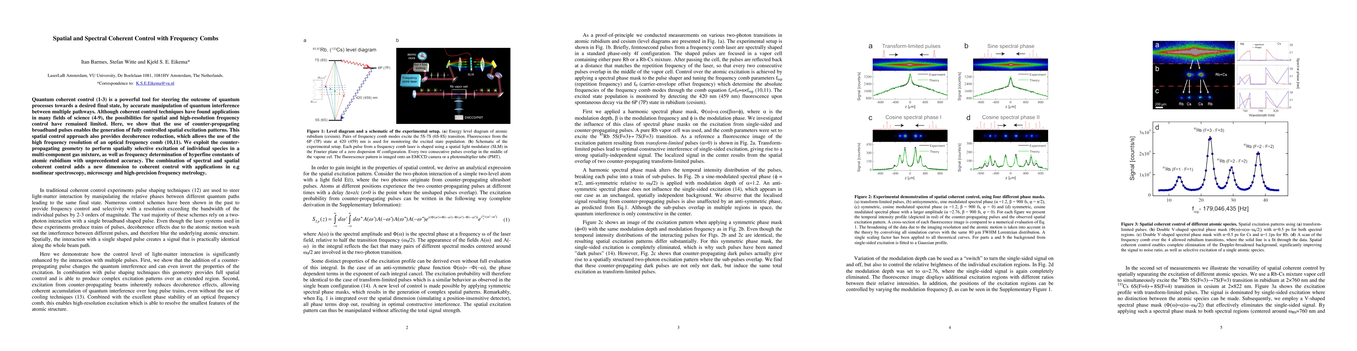Quantum coherent control (1-3) is a powerful tool for steering the outcome of quantum processes towards a desired final state, by accurate manipulation of quantum interference between multiple pathways. Although coherent control techniques have found applications in many fields of science (4-9), the possibilities for spatial and high-resolution frequency control have remained limited. Here, we show that the use of counter-propagating broadband pulses enables the generation of fully controlled spatial excitation patterns. This spatial control approach also provides decoherence reduction, which allows the use of the high frequency resolution of an optical frequency comb (10,11). We exploit the counter-propagating geometry to perform spatially selective excitation of individual species in a multi-component gas mixture, as well as frequency determination of hyperfine constants of atomic rubidium with unprecedented accuracy. The combination of spectral and spatial coherent control adds a new dimension to coherent control with applications in e.g nonlinear spectroscopy, microscopy and high-precision frequency metrology.