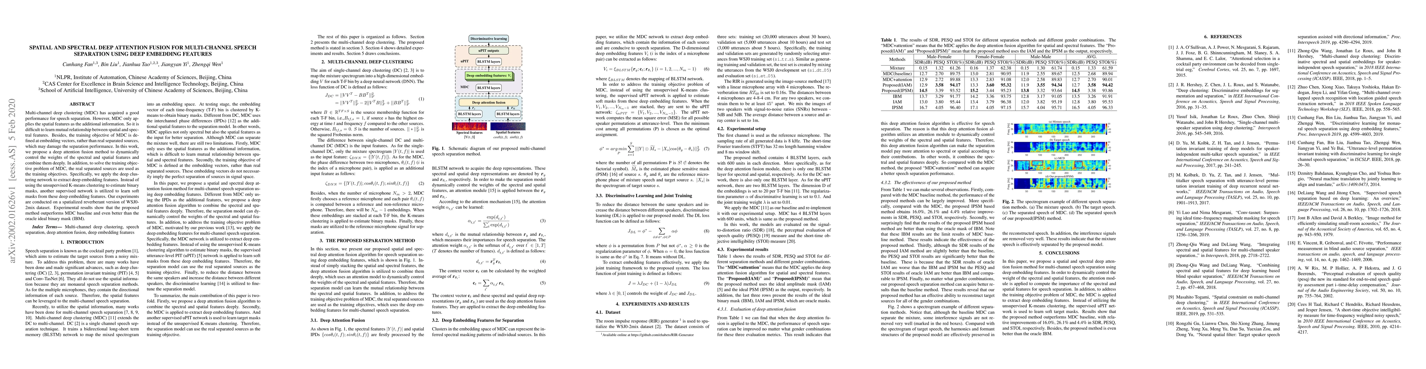 This paper proposes a deep attention fusion method for multi-channel speech separation that dynamically weights spectral and spatial features. It uses deep clustering networks for feature extraction and supervised learning for mask estimation, achieving better performance than the baseline multi-channel deep clustering method.