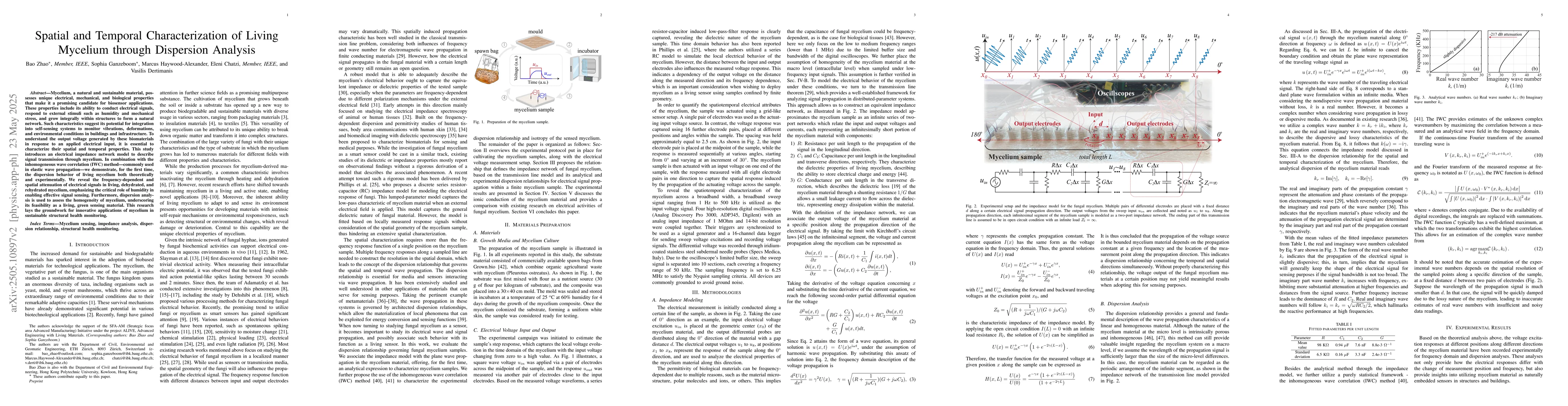 This study characterizes living mycelium's spatial and temporal properties through dispersion analysis, revealing its potential for sustainable structural health monitoring and biosensing applications.