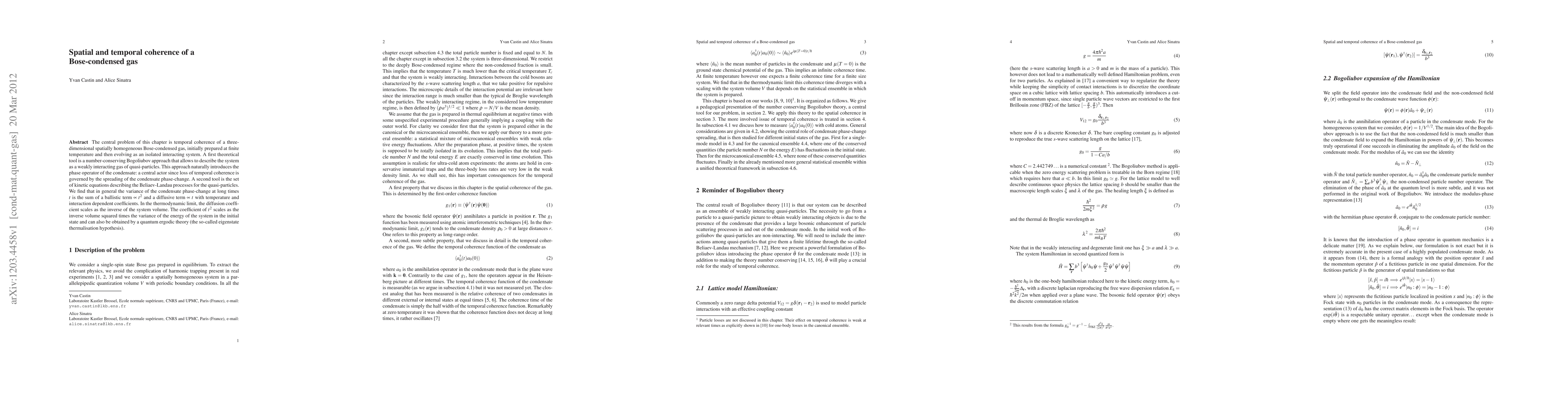 The central problem of this chapter is temporal coherence of a three-dimensional spatially homogeneous Bose-condensed gas, initially prepared at finite temperature and then evolving as an isolated interacting system. A first theoretical tool is a number-conserving Bogoliubov approach that allows to describe the system as a weakly interacting gas of quasi-particles. This approach naturally introduces the phase operator of the condensate: a central actor since loss of temporal coherence is governed by the spreading of the condensate phase-change. A second tool is the set of kinetic equations describing the Beliaev-Landau processes for the quasi-particles. We find that in general the variance of the condensate phase-change at long times $t$ is the sum of a ballistic term $\propto t^2$ and a diffusive term $\propto t$ with temperature and interaction dependent coefficients. In the thermodynamic limit, the diffusion coefficient scales as the inverse of the system volume. The coefficient of $t^2$ scales as the inverse volume squared times the variance of the energy of the system in the initial state and can also be obtained by a quantum ergodic theory (the so-called eigenstate thermalisation hypothesis).