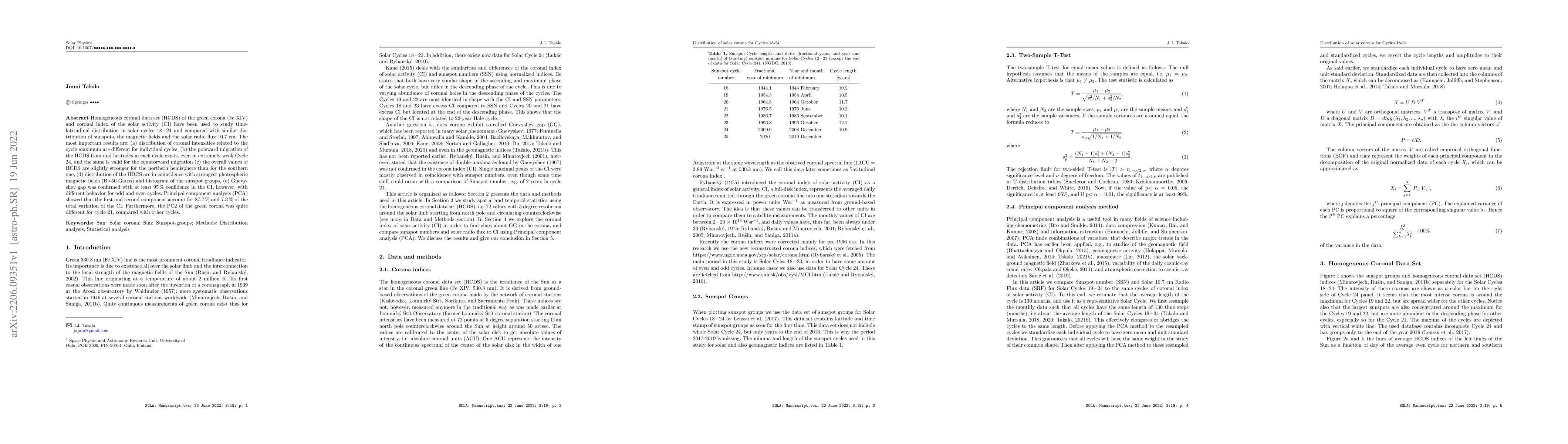 Homogeneous coronal data set (HCDS) of the green corona (Fe XIV) and coronal index of the solar activity (CI) have been used to study time-latitudinal distribution in solar cycles 18-24 and compared with similar distribution of sunspots, the magnetic fields and the solar radio flux 10.7 cm. The most important results are: (a) distribution of coronal intensities related to the cycle maximum are different for individual cycles, (b) the poleward migration of the HCDS from mid latitudes in each cycle exists, even in extremely weak Cycle 24, and the same is valid for the equatorward migration (c) the overall values of HCDS are slightly stronger for the northern hemisphere than for the southern one, (d) distribution of the HDCS are in coincidence with strongest photospheric magnetic fields (B>50 Gauss) and histogram of the sunspot groups, (e) Gnevyshev gap was confirmed with at least 95% confidence in the CI, however, with different behavior for odd and even cycles. Principal component analysis (PCA) showed that the first and second component account for 87.7% and 7.3% of the total variation of the CI. Furthermore, the PC2 of the green corona was quite different for cycle 21, compared with other cycles.