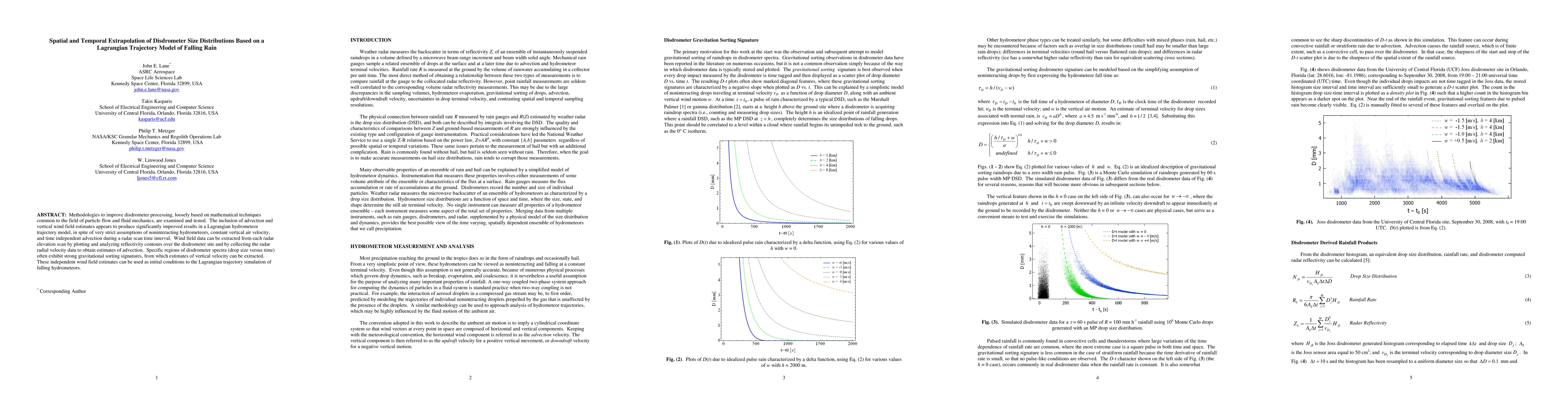 Methodologies to improve disdrometer processing, loosely based on mathematical techniques common to the field of particle flow and fluid mechanics, are examined and tested. The inclusion of advection and vertical wind field estimates appears to produce significantly improved results in a Lagrangian hydrometeor trajectory model, in spite of very strict assumptions of noninteracting hydrometeors, constant vertical air velocity, and time independent advection during a radar scan time interval. Wind field data can be extracted from each radar elevation scan by plotting and analyzing reflectivity contours over the disdrometer site and by collecting the radar radial velocity data to obtain estimates of advection. Specific regions of disdrometer spectra (drop size versus time) often exhibit strong gravitational sorting signatures, from which estimates of vertical velocity can be extracted. These independent wind field estimates can be used as initial conditions to the Lagrangian trajectory simulation of falling hydrometeors.