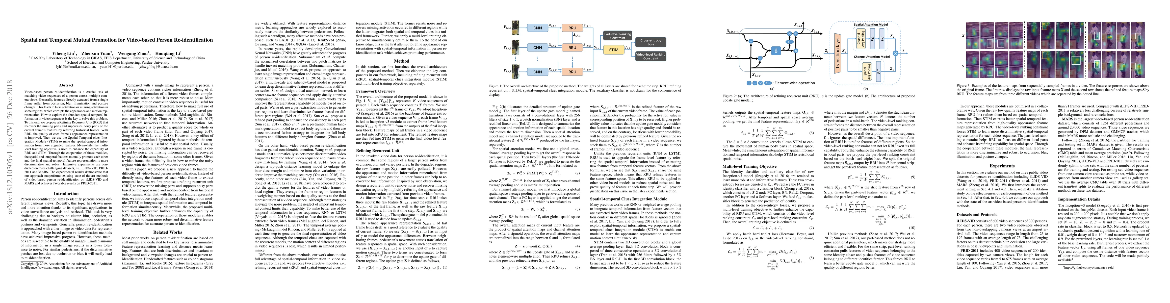 This paper proposes a Refining Recurrent Unit (RRU) to enhance single-frame features by leveraging historical frames, and a Spatial-Temporal clues Integration Module (STIM) to extract robust spatial-temporal features. The mutual promotion between spatial and temporal features leads to improved person re-identification performance on three datasets.