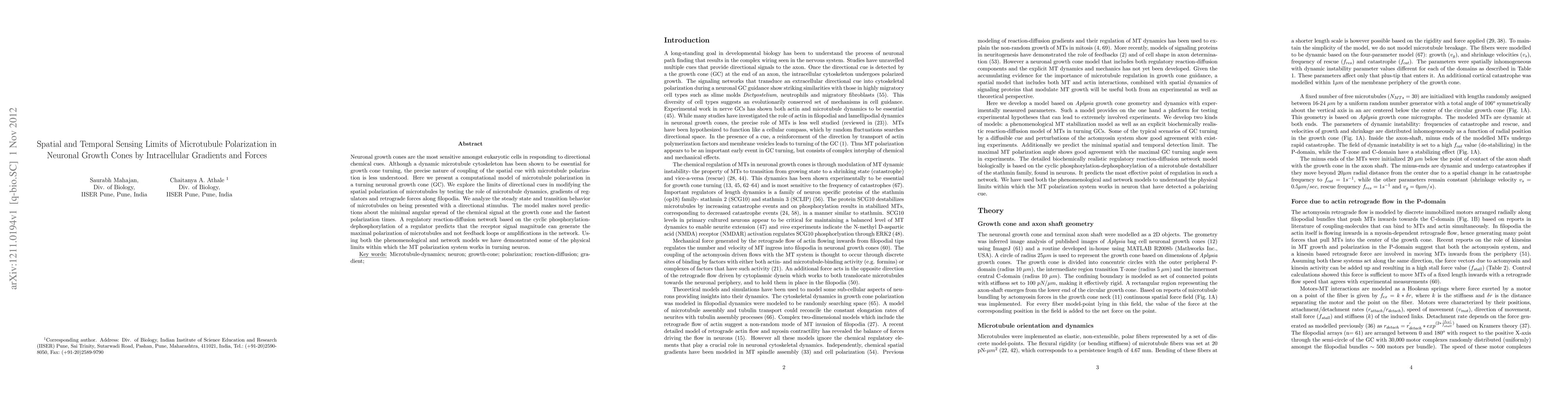 This paper presents a computational model to explore how microtubule polarization in neuronal growth cones responds to directional chemical cues, focusing on the role of microtubule dynamics, intracellular gradients, and retrograde forces. The study reveals the limits of spatial and temporal sensing, predicting the minimal angular spread of chemical signals and the fastest polarization times, and suggests that receptor signal magnitude is key for maximal polarization.