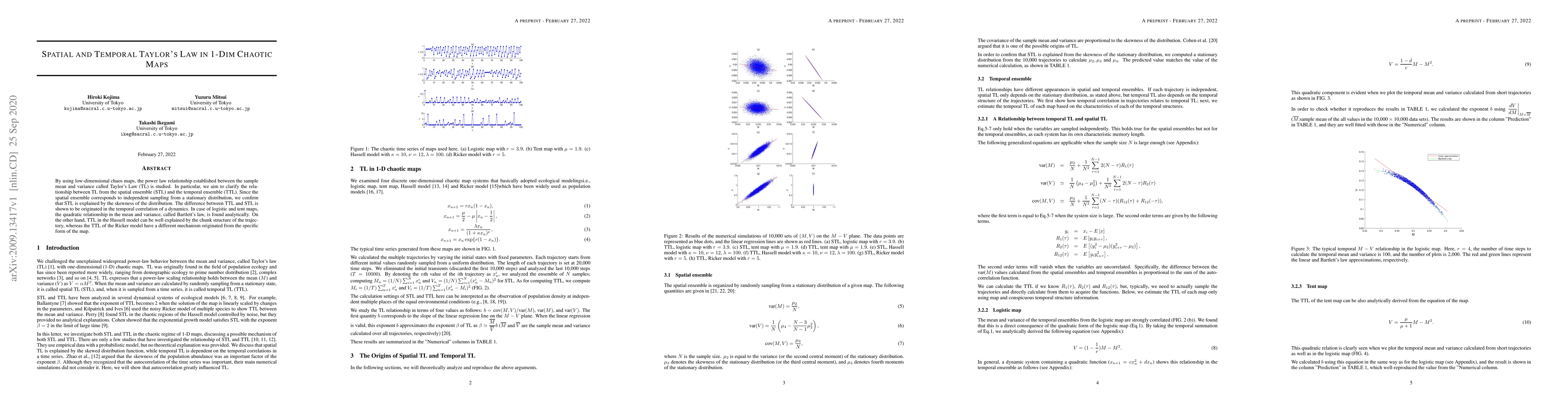 By using low-dimensional chaos maps, the power law relationship established between the sample mean and variance called Taylor's Law (TL) is studied. In particular, we aim to clarify the relationship between TL from the spatial ensemble (STL) and the temporal ensemble (TTL). Since the spatial ensemble corresponds to independent sampling from a stationary distribution, we confirm that STL is explained by the skewness of the distribution. The difference between TTL and STL is shown to be originated in the temporal correlation of a dynamics. In case of logistic and tent maps, the quadratic relationship in the mean and variance, called Bartlett's law, is found analytically. On the other hand, TTL in the Hassell model can be well explained by the chunk structure of the trajectory, whereas the TTL of the Ricker model have a different mechanism originated from the specific form of the map.