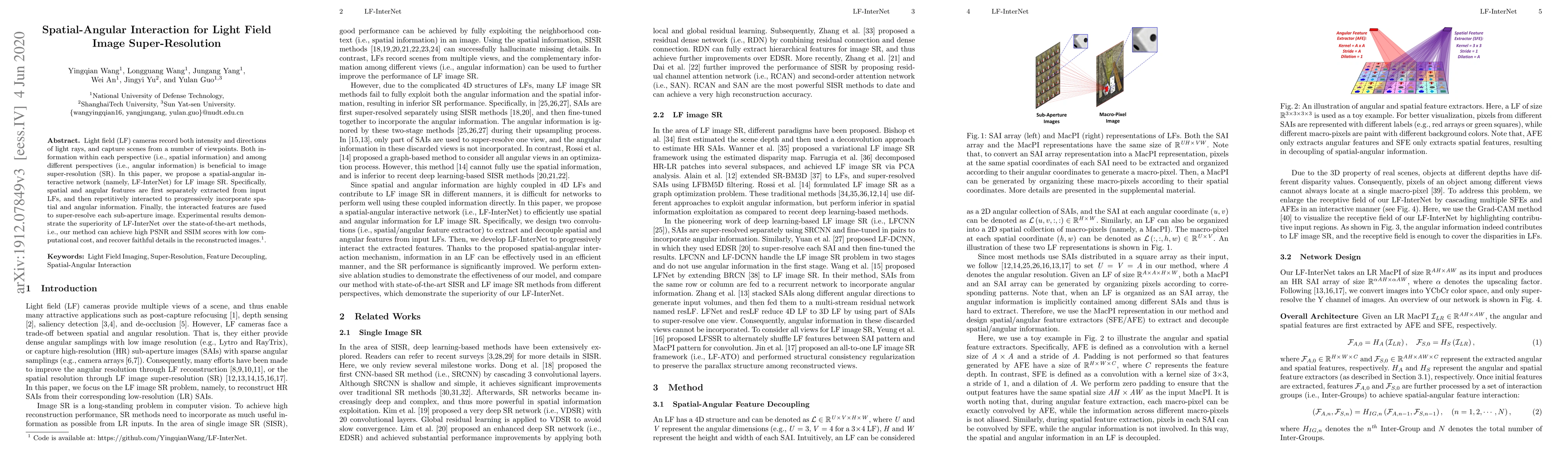 This paper proposes a spatial-angular interactive network (LF-InterNet) for super-resolving light field images by extracting and iteratively combining spatial and angular features. The method achieves high PSNR and SSIM scores with low computational cost and recovers detailed reconstructed images.