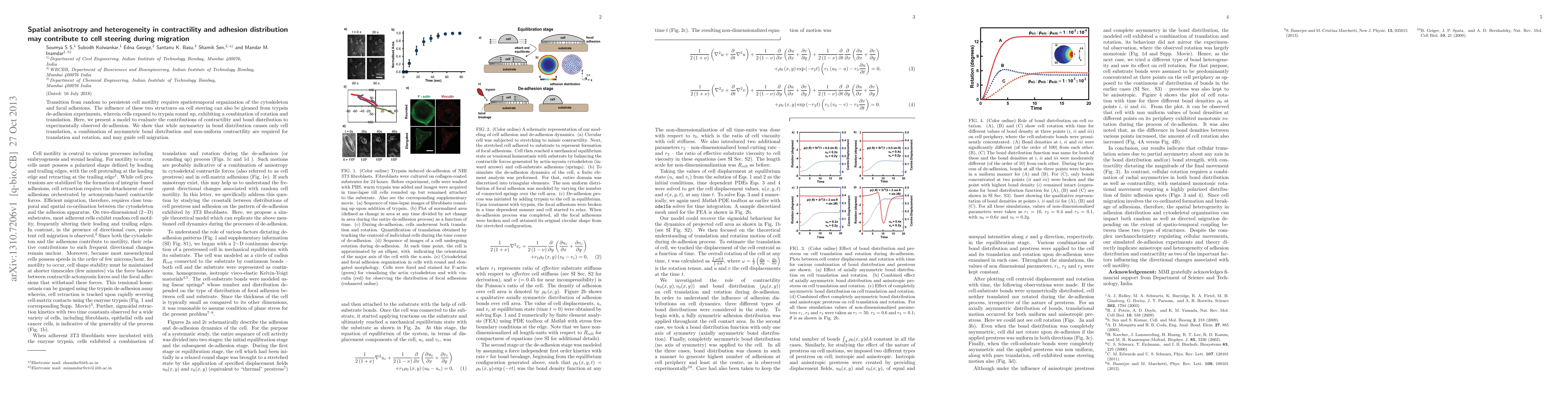 This paper proposes a model to assess how spatial anisotropy and heterogeneity in contractility and adhesion influence cell steering during migration. It demonstrates that asymmetric bond distribution alone causes cell translation, while a combination of asymmetric bond distribution and non-uniform contractility facilitates both translation and rotation, potentially guiding cell migration.