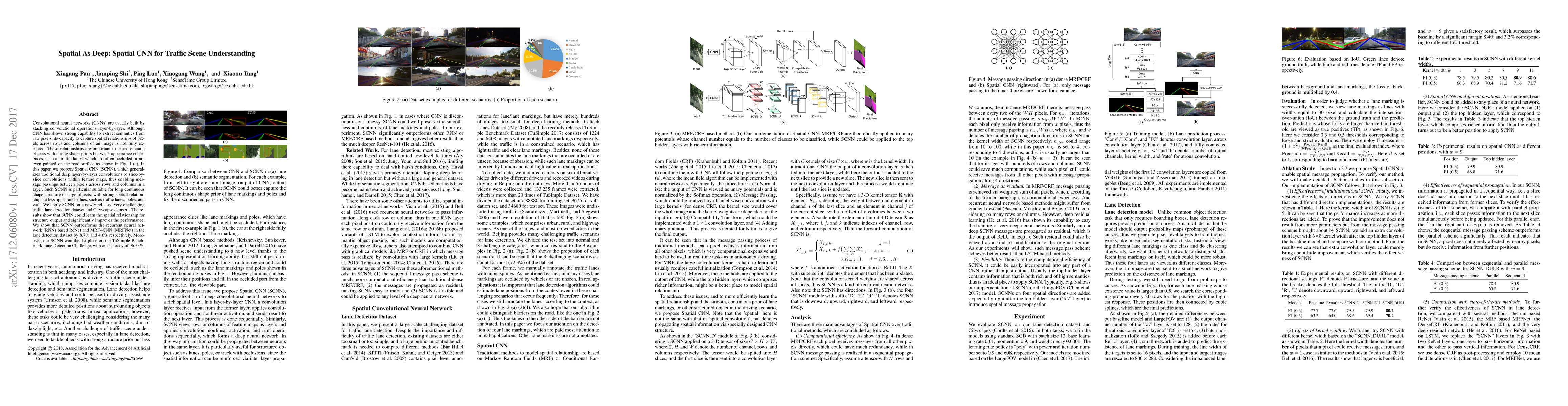 This paper introduces Spatial CNN (SCNN), a novel convolutional neural network designed to better capture spatial relationships in images, particularly useful for detecting long continuous structures like traffic lanes. SCNN outperforms traditional CNNs and other methods like RNN-based ReNet and MRF+CNN, achieving top results in lane detection benchmarks.