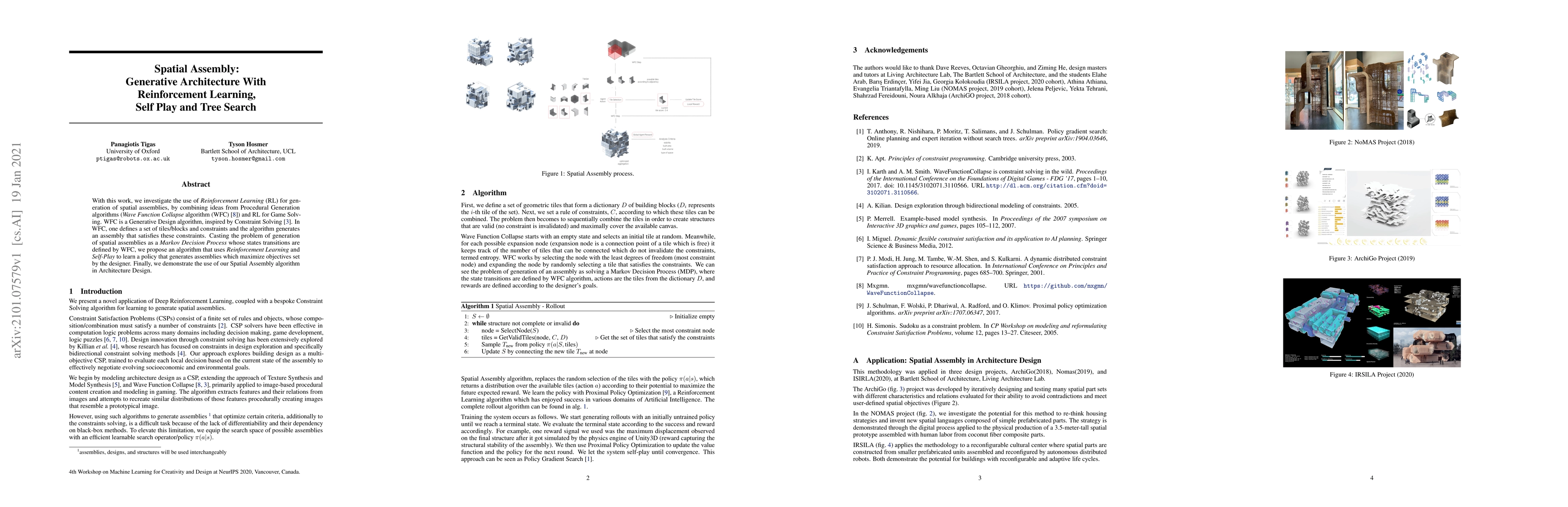 With this work, we investigate the use of Reinforcement Learning (RL) for the generation of spatial assemblies, by combining ideas from Procedural Generation algorithms (Wave Function Collapse algorithm (WFC)) and RL for Game Solving. WFC is a Generative Design algorithm, inspired by Constraint Solving. In WFC, one defines a set of tiles/blocks and constraints and the algorithm generates an assembly that satisfies these constraints. Casting the problem of generation of spatial assemblies as a Markov Decision Process whose states transitions are defined by WFC, we propose an algorithm that uses Reinforcement Learning and Self-Play to learn a policy that generates assemblies that maximize objectives set by the designer. Finally, we demonstrate the use of our Spatial Assembly algorithm in Architecture Design.