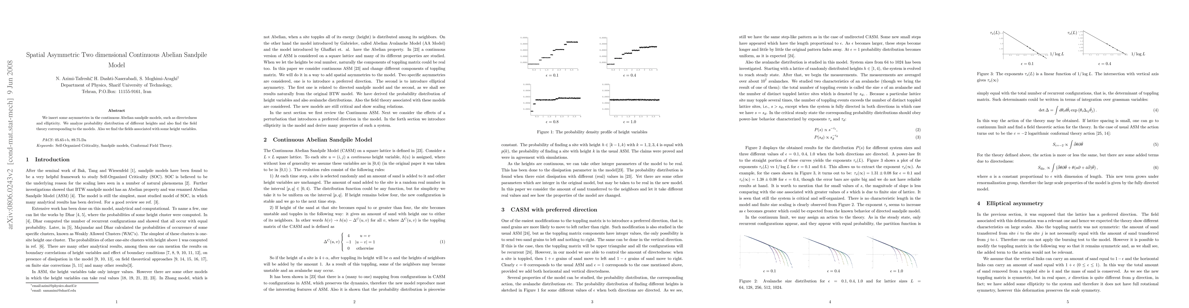 The paper introduces asymmetric continuous Abelian sandpile models with directedness and ellipticity, analyzing the probability distribution of height variations and establishing a corresponding field theory, alongside identifying fields linked to height variables.