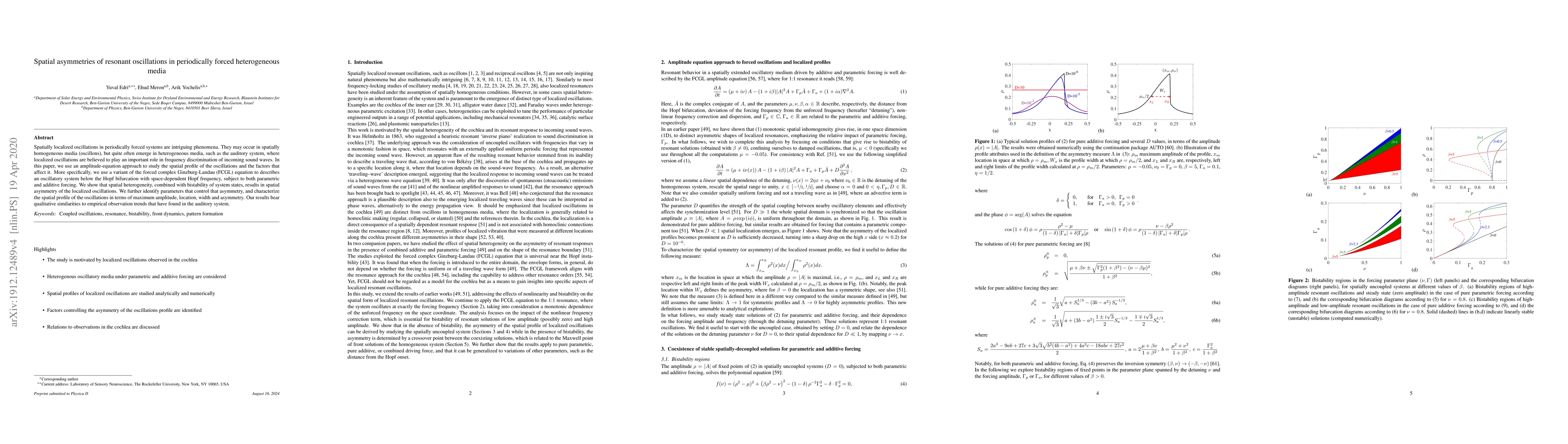 Spatially localized oscillations in periodically forced systems are intriguing phenomena. They may occur in spatially homogeneous media (oscillons), but quite often emerge in heterogeneous media, such as the auditory system, where localized oscillations are believed to play an important role in frequency discrimination of incoming sound waves. In this paper, we use an amplitude-equation approach to study the spatial profile of the oscillations and the factors that affect it. More specifically, we use a variant of the forced complex Ginzburg-Landau (FCGL) equation to describes an oscillatory system below the Hopf bifurcation with space-dependent Hopf frequency, subject to both parametric and additive forcing. We show that spatial heterogeneity, combined with bistability of system states, results in spatial asymmetry of the localized oscillations. We further identify parameters that control that asymmetry, and characterize the spatial profile of the oscillations in terms of maximum amplitude, location, width and asymmetry. Our results bear qualitative similarities to empirical observation trends that have found in the auditory system.