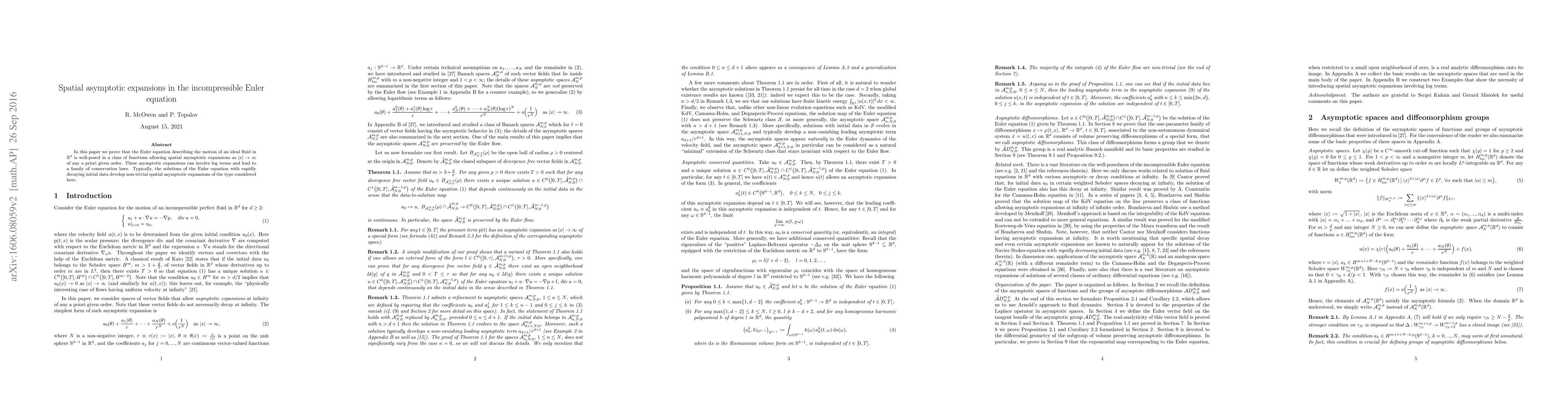 In this paper we prove that the Euler equation describing the motion of an ideal fluid in $\R^d$ is well-posed in a class of functions allowing spatial asymptotic expansions as $|x|\to\infty$ of any a priori given order. These asymptotic expansions can involve log terms and lead to a family of conservation laws. Typically, the solutions of the Euler equation with initial data in the Schwartz class develop non-trivial spatial asymptotic expansions of the type considered here.