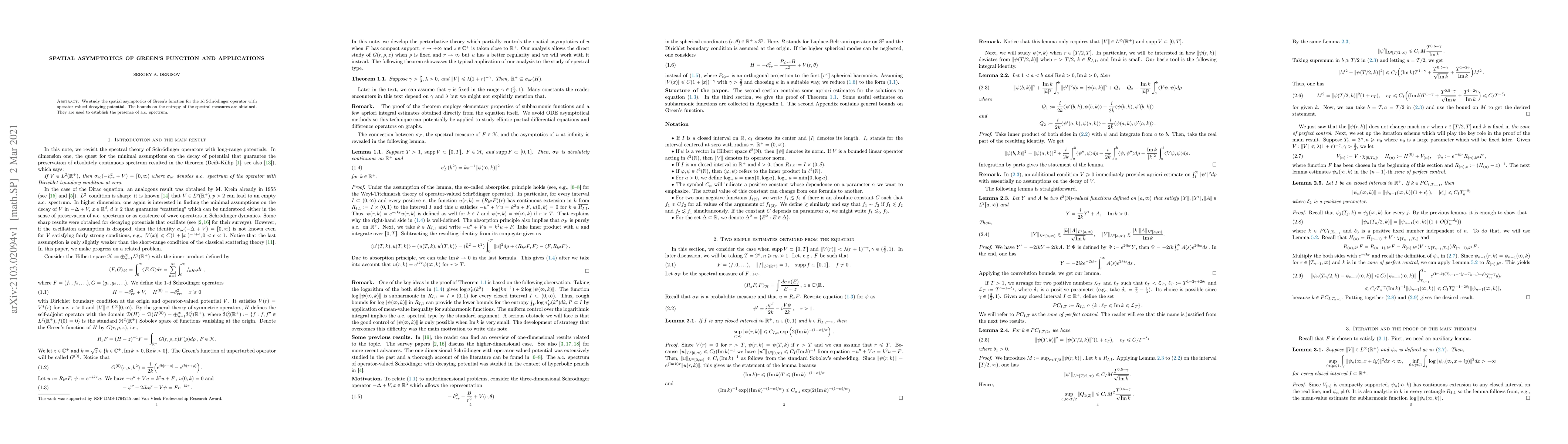 This paper investigates the spatial asymptotic behavior of Green's function for the 1d Schrödinger operator with a decaying potential, deriving bounds on the entropy of spectral measures, which are then applied to demonstrate the existence of an absolutely continuous spectrum.