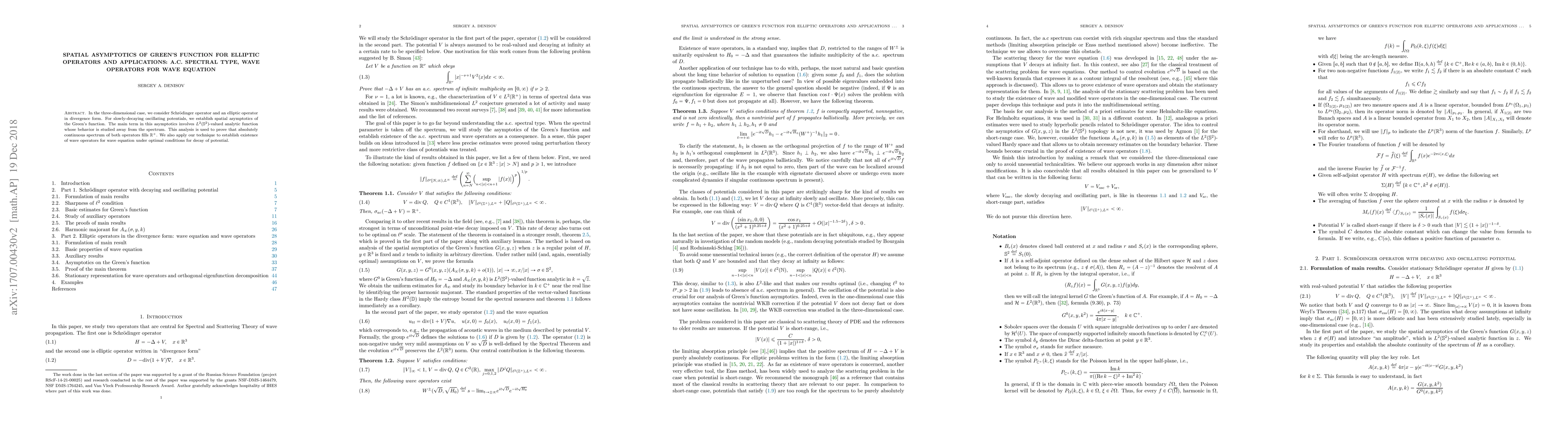In three-dimensional case, we consider two classical operators: Schrodinger operator and an operator in the divergence form. For slowly-decaying oscillating potentials, we establish spatial asymptotics of the Green's function. The main term in this asymptotics involves vector-valued analytic function whose behavior is studied away from the spectrum. The absolute continuity of the spectrum is established as a corollary. For the operator in the divergence form, we consider the wave equation and establish existence of wave operators.