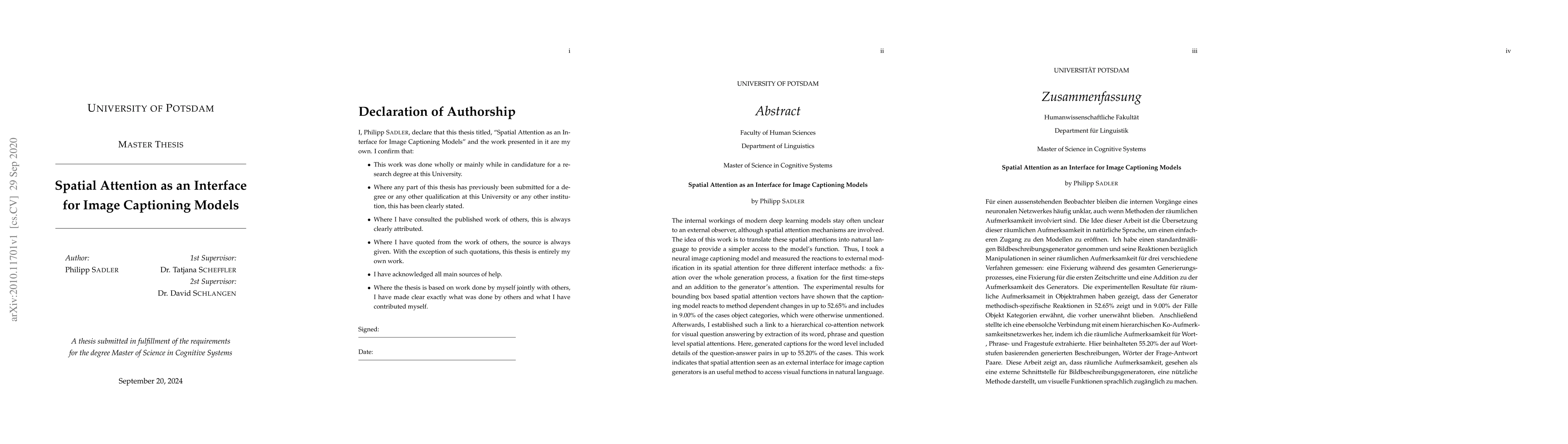 The internal workings of modern deep learning models stay often unclear to an external observer, although spatial attention mechanisms are involved. The idea of this work is to translate these spatial attentions into natural language to provide a simpler access to the model's function. Thus, I took a neural image captioning model and measured the reactions to external modification in its spatial attention for three different interface methods: a fixation over the whole generation process, a fixation for the first time-steps and an addition to the generator's attention. The experimental results for bounding box based spatial attention vectors have shown that the captioning model reacts to method dependent changes in up to 52.65% and includes in 9.00% of the cases object categories, which were otherwise unmentioned. Afterwards, I established such a link to a hierarchical co-attention network for visual question answering by extraction of its word, phrase and question level spatial attentions. Here, generated captions for the word level included details of the question-answer pairs in up to 55.20% of the cases. This work indicates that spatial attention seen as an external interface for image caption generators is an useful method to access visual functions in natural language.