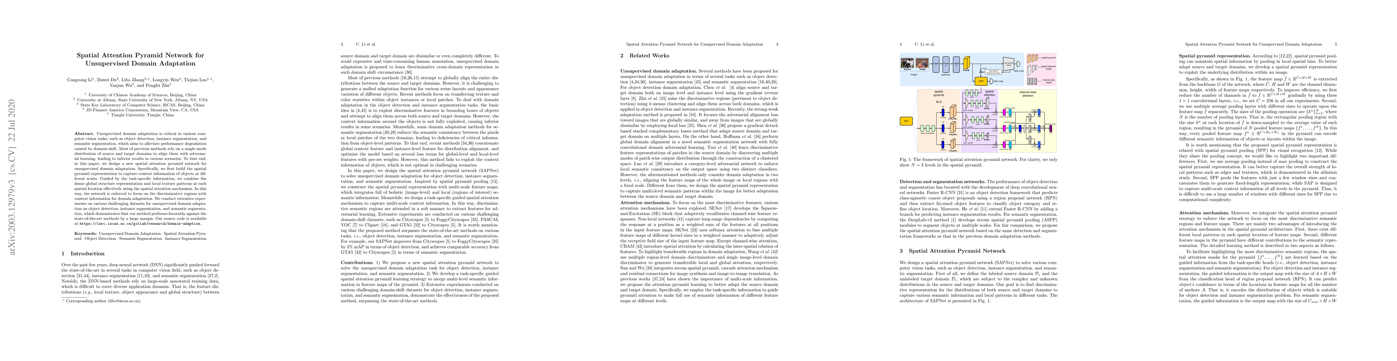 This paper proposes a spatial attention pyramid network for unsupervised domain adaptation to improve performance in tasks like object detection and segmentation by addressing domain-shift. The network captures context and texture information at multiple scales and focuses on discriminative regions using spatial attention, outperforming existing methods in experiments.