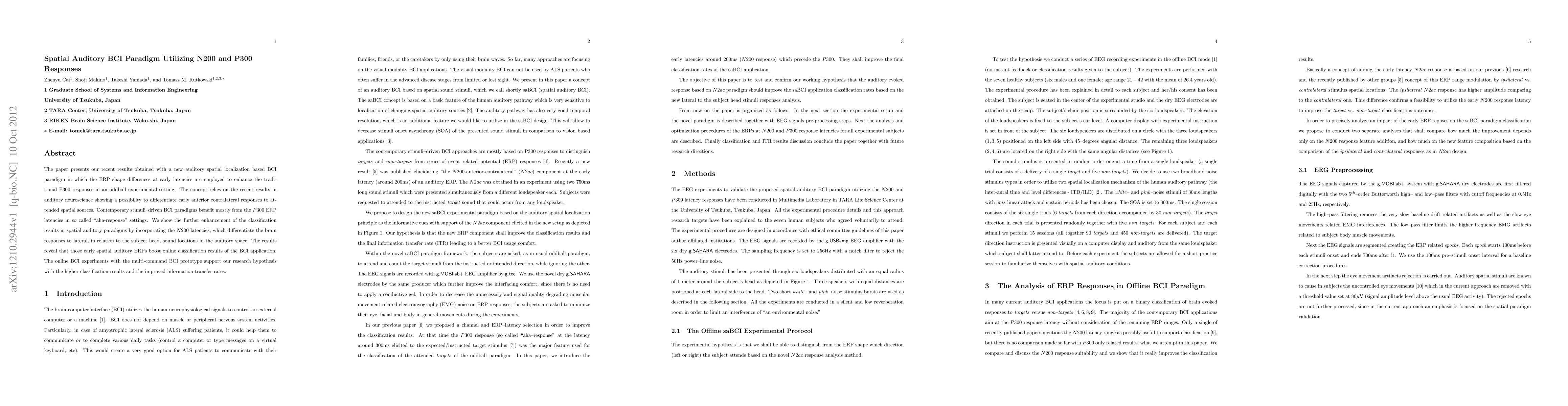 This paper introduces a new auditory spatial BCI paradigm that leverages both N200 and P300 event-related potentials to enhance traditional P300 responses in oddball settings, showing improved online classification results and higher information-transfer-rates compared to conventional methods.