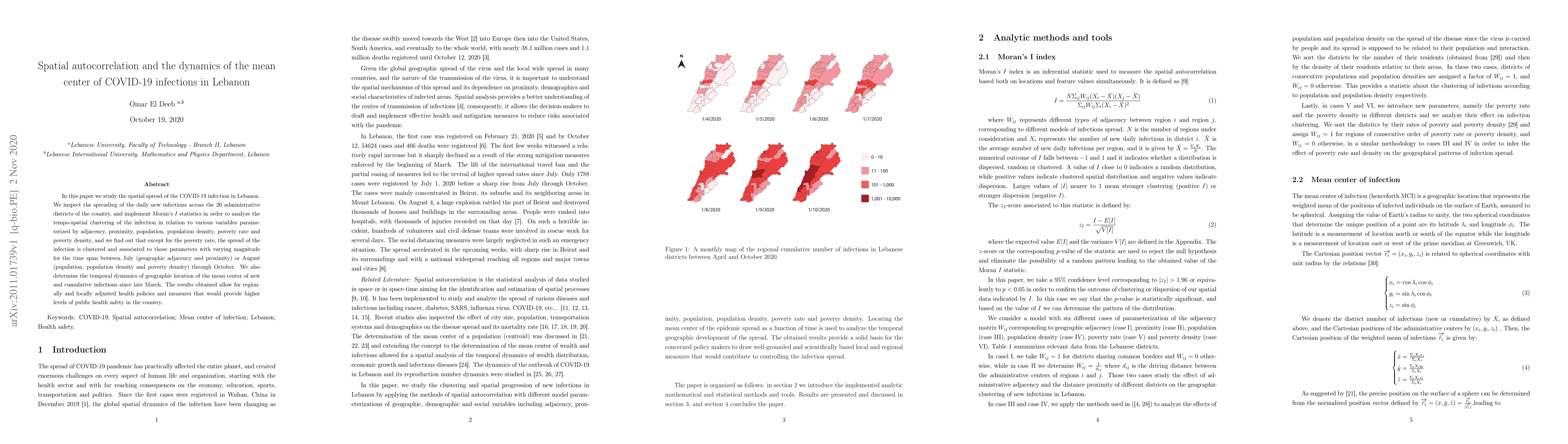 In this paper we study the spatial spread of the COVID-19 infection in Lebanon. We inspect the spreading of the daily new infections across the 26 administrative districts of the country, and implement Moran's $I$ statistics in order to analyze the tempo-spatial clustering of the infection in relation to various variables parameterized by adjacency, proximity, population, population density, poverty rate and poverty density, and we find out that except for the poverty rate, the spread of the infection is clustered and associated to those parameters with varying magnitude for the time span between July (geographic adjacency and proximity) or August (population, population density and poverty density) through October. We also determine the temporal dynamics of geographic location of the mean center of new and cumulative infections since late March. The results obtained allow for regionally and locally adjusted health policies and measures that would provide higher levels of public health safety in the country.