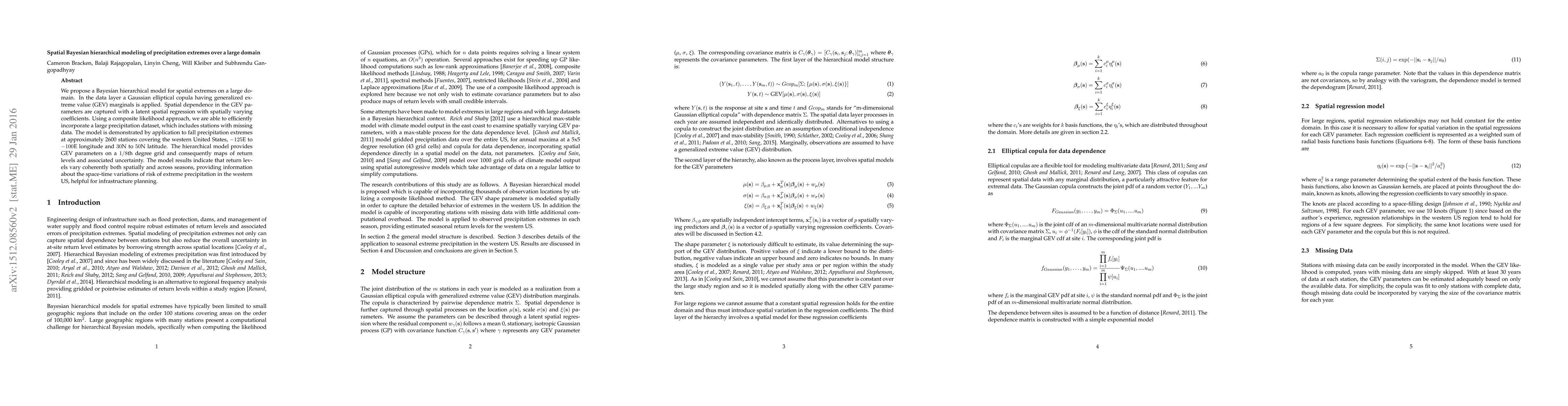 This paper proposes a Bayesian hierarchical model to analyze precipitation extremes over a large spatial domain using a Gaussian elliptical copula with GEV marginals and latent spatial regression. The model efficiently handles large datasets with missing data, demonstrating its application to fall precipitation extremes across 2600 stations in the western US, providing maps of return levels and associated uncertainties to inform infrastructure planning.