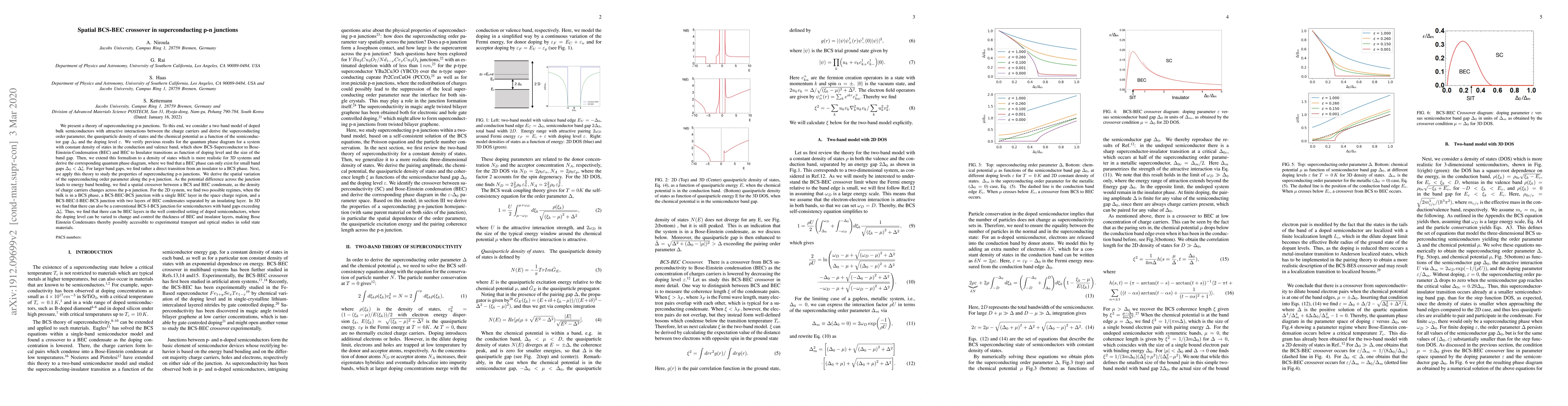 This paper develops a theoretical framework for superconducting p-n junctions in doped semiconductors, revealing a spatial BCS-BEC crossover driven by varying charge carrier densities. The study identifies distinct junction regimes, including BCS-BEC-BCS and BCS-BEC-I-BEC-BCS configurations, and suggests that BEC phases can be experimentally accessible in controlled semiconductor environments.