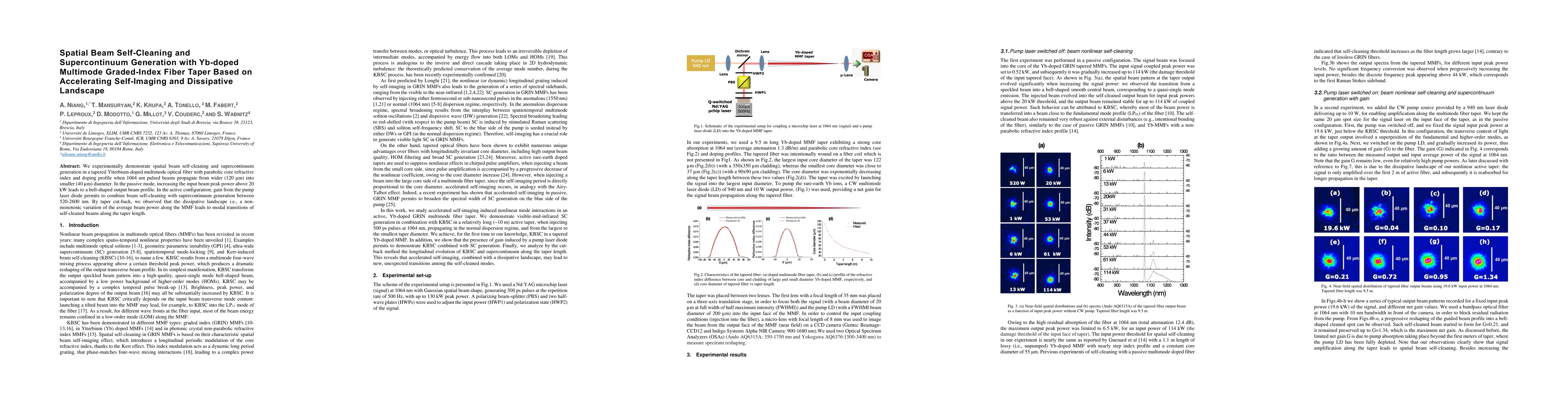 We experimentally demonstrate spatial beam self-cleaning and supercontinuum generation in a tapered Ytterbium-doped multimode optical fiber with parabolic core refractive index and doping profile when 1064 nm pulsed beams propagate from wider (120 micrometers) into smaller (40 micrometers) diameter. In the passive mode, increasing the input beam peak power above 20 kW leads to a bell-shaped output beam profile. In the active configuration, gain from the pump laser diode permits to combine beam self-cleaning with supercontinuum generation between 520-2600 nm. By taper cut-back, we observed that the dissipative landscape i.e., a non-monotonic variation of the average beam power along the MMF leads to modal transitions of self-cleaned beams along the taper length.